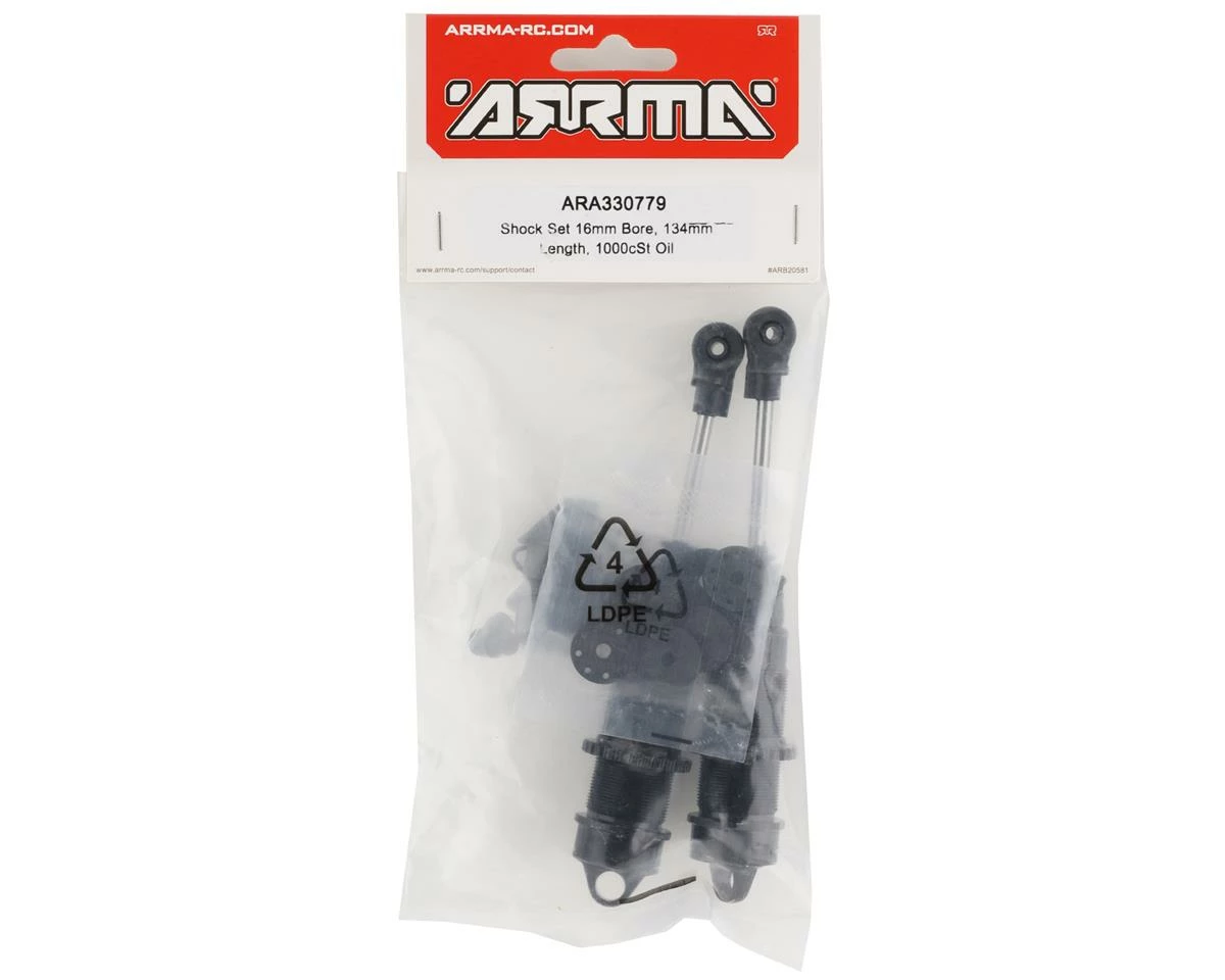 Arrma 134mm Pre-Assembled 16mm Shock Set. This replacement shock set is intended for the Arrma Fireteam 6S BLX, however, they will also work with the Arrma Kraton 6S BLX. These shocks come pre-assembled and pre-filled with 1000cSt shock fluid. Package includes two pre-assembled shocks.