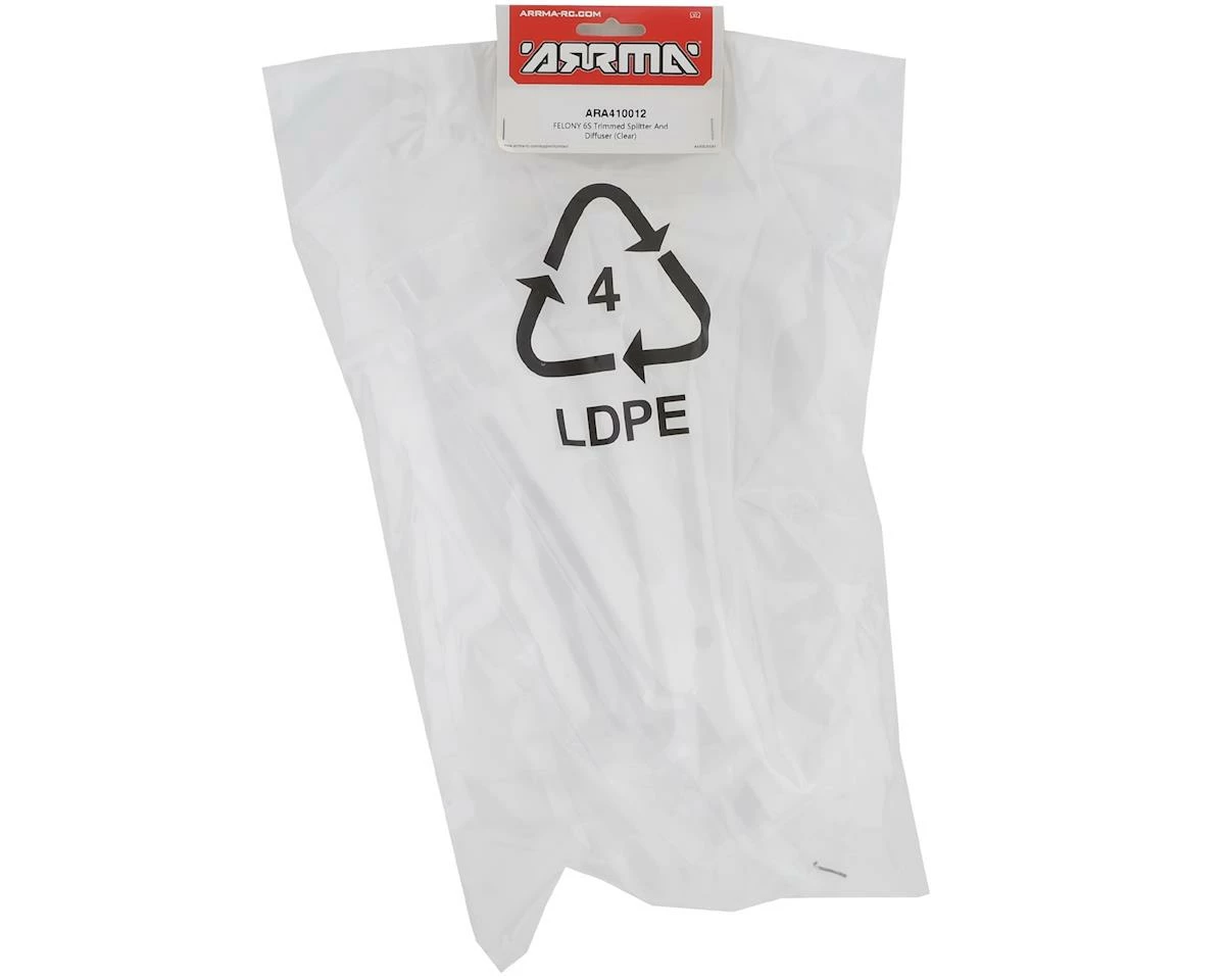 This is an optional Arrma Clear Felony 6S Splitter & Diffuser, intended for use with the Felony 6S BLX Brushless 1/7 Scale Electric 4WD Street Bash Muscle Car. This blank splitter and diffuser allows you to add a custom look to your Felony 6S.