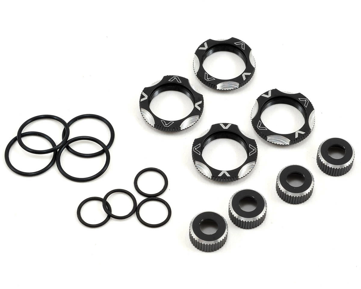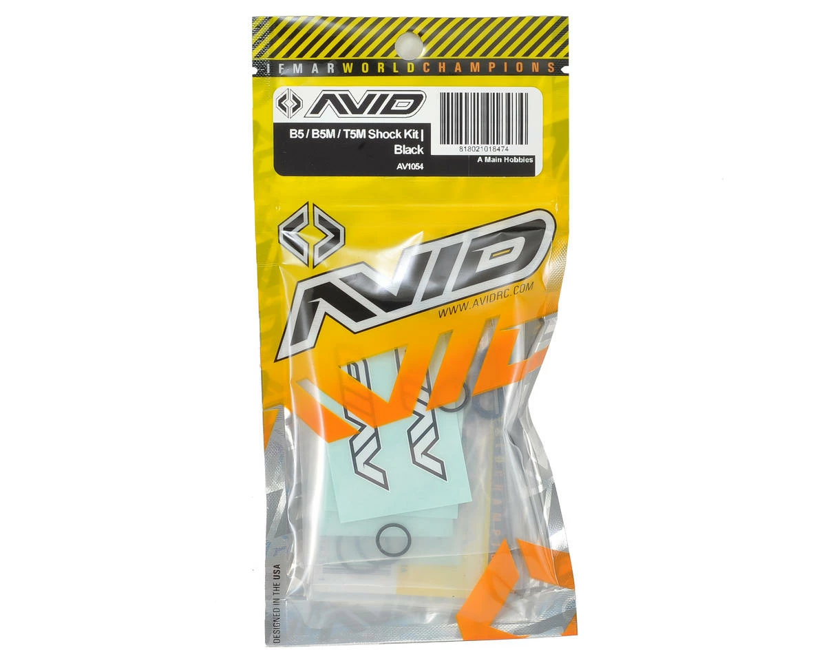 The Avid RC10B5/T5M Black Shock Kit includes everything needed to completely change the aesthetics of your shocks with black aluminum parts. The kit includes four threaded shock collars that feature offset laser etched Avid logo’s for ease of matching spring tension left and right in 1/4 turn increments. The shock bottom caps are knurled with a silver highlight edging that makes it easy to remove the caps for a rebuild and adds an extra touch of bling.