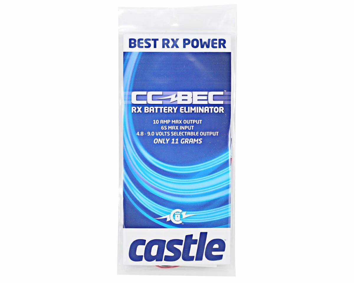 This is the Castle Creations CCBEC, 10 Amp Adjustable BEC. The CC BEC is a little device that eliminates the need for a receiver and servo battery pack. It draws higher voltage from the motor batteries and drops it to a voltage level that is suitable for your receiver and servos. This is required in applications which draw high power for multiple servos or use more than 3S motor packs, as most ESCs with linear BECs are not designed for these applications.