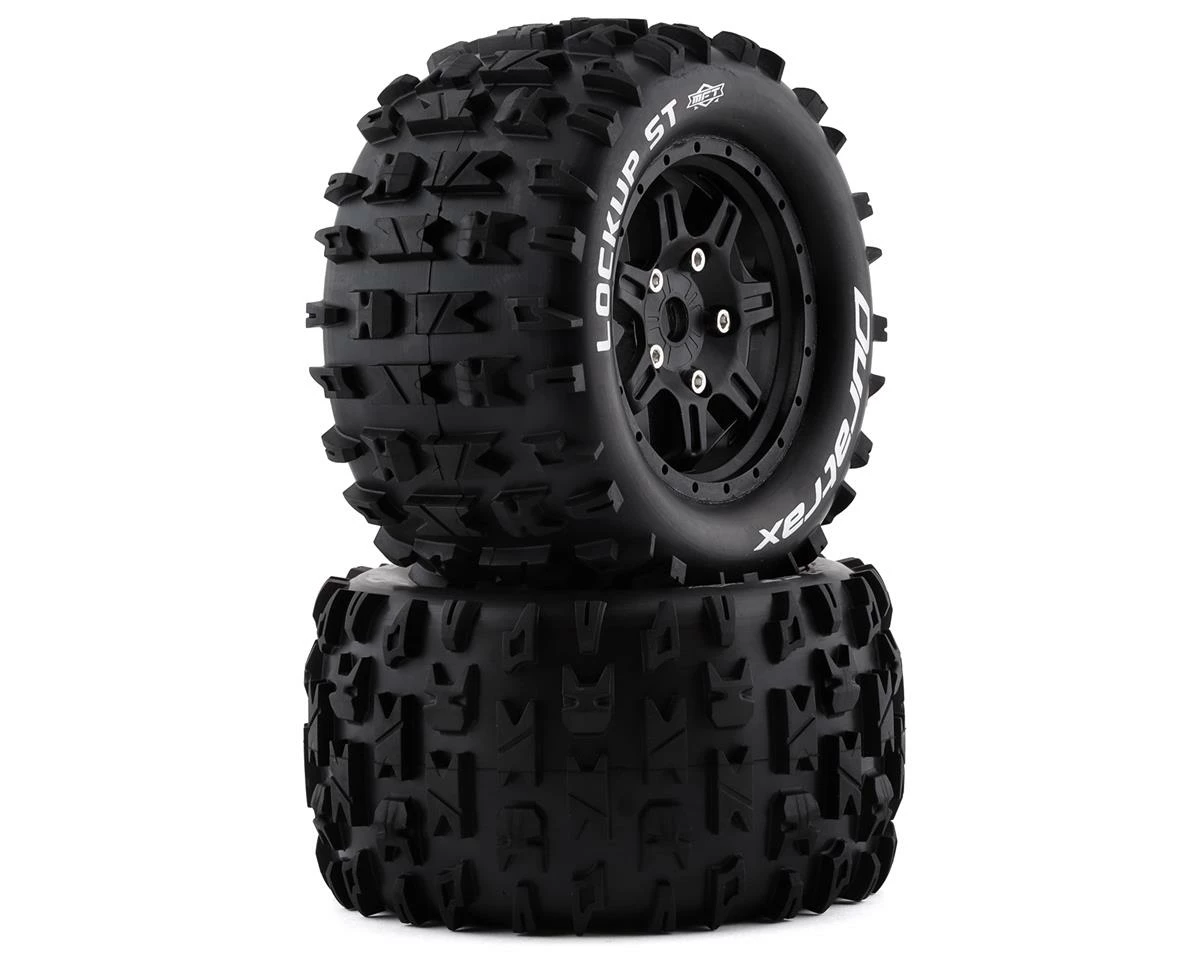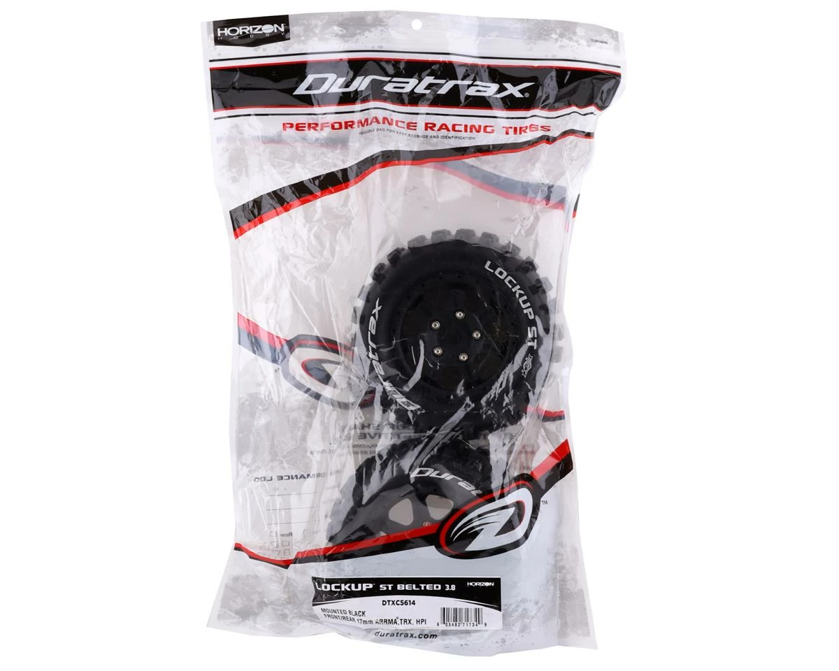 The DuraTrax Lockup ST Belted 3.8″ Pre-Mounted Truck Tires come ready to bash. These tire have been designed to work with Traxxas and ARRMA 1/8 scale vehicles equipped with a 17mm hex. Featuring MFT belts (Micro Fiber Technology) these tires weigh less, balloon less, distort less, and are more durable than ever. MFT not only enhances the durability of the tire but also provides ultimate performance and traction.