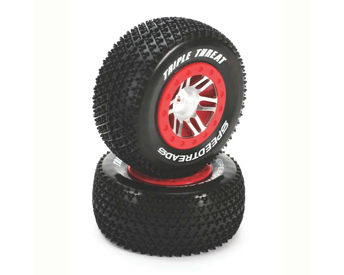 This is a pack of two premounted DuraTrax SpeedTreads Triple Threat Short Course Tires, intended for the front of the Traxxas Slash and Rustler. These tires are glued to the wheel and feature a 12mm Hex.