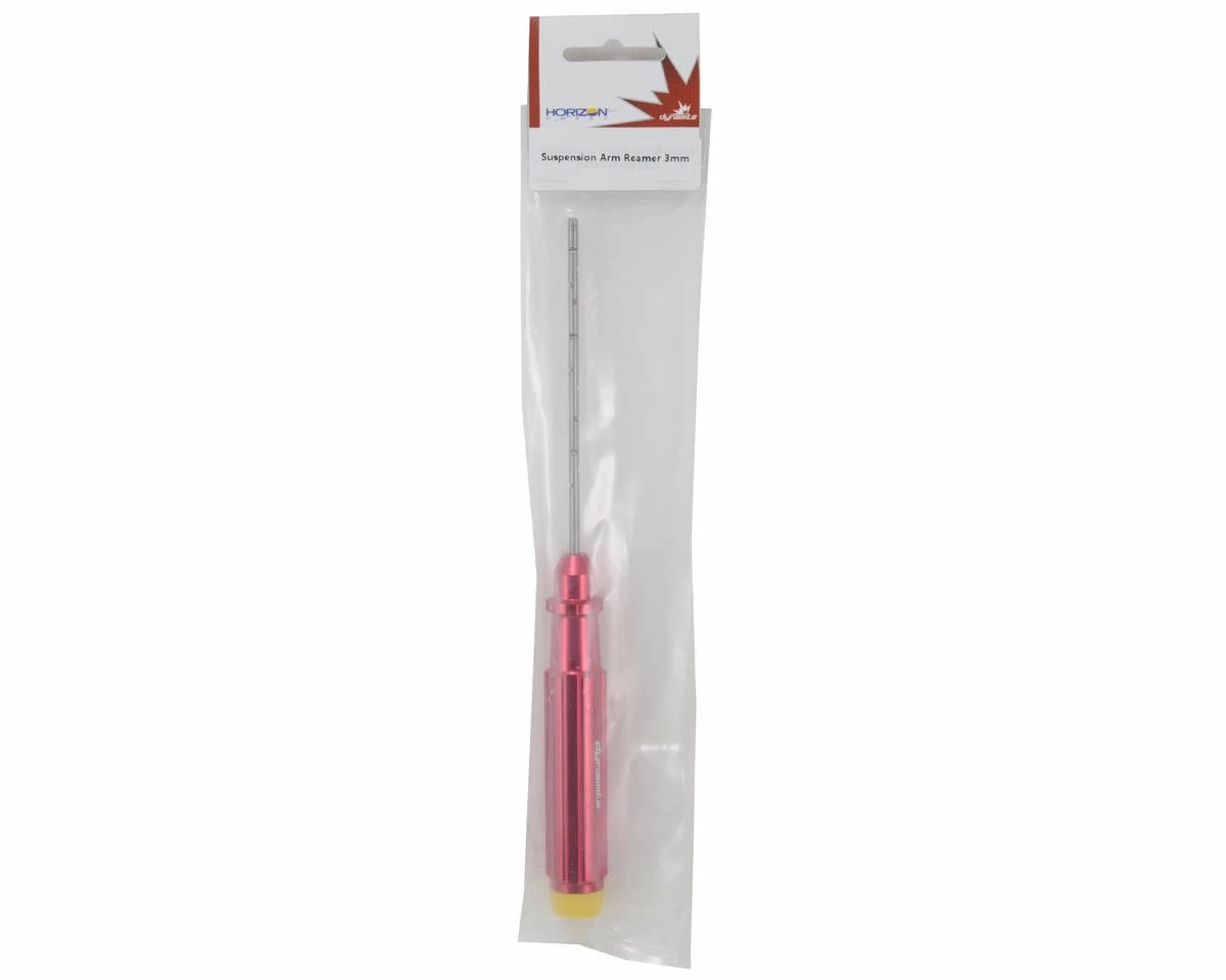 This is a Dynamite 3mm Suspension Arm Reamer. Dynamite tools feature stylish red anodized aluminum handles, with replaceable steel tips. To make wrenching easier on your hands, the handles include rotating plastic end caps to swivel in your palm. Plus, the end caps are color coded for easy identification. This reamer is perfect for cleaning out the hinge pin holes in your suspension arms, creating a precision sized hole and a free moving suspension arm.