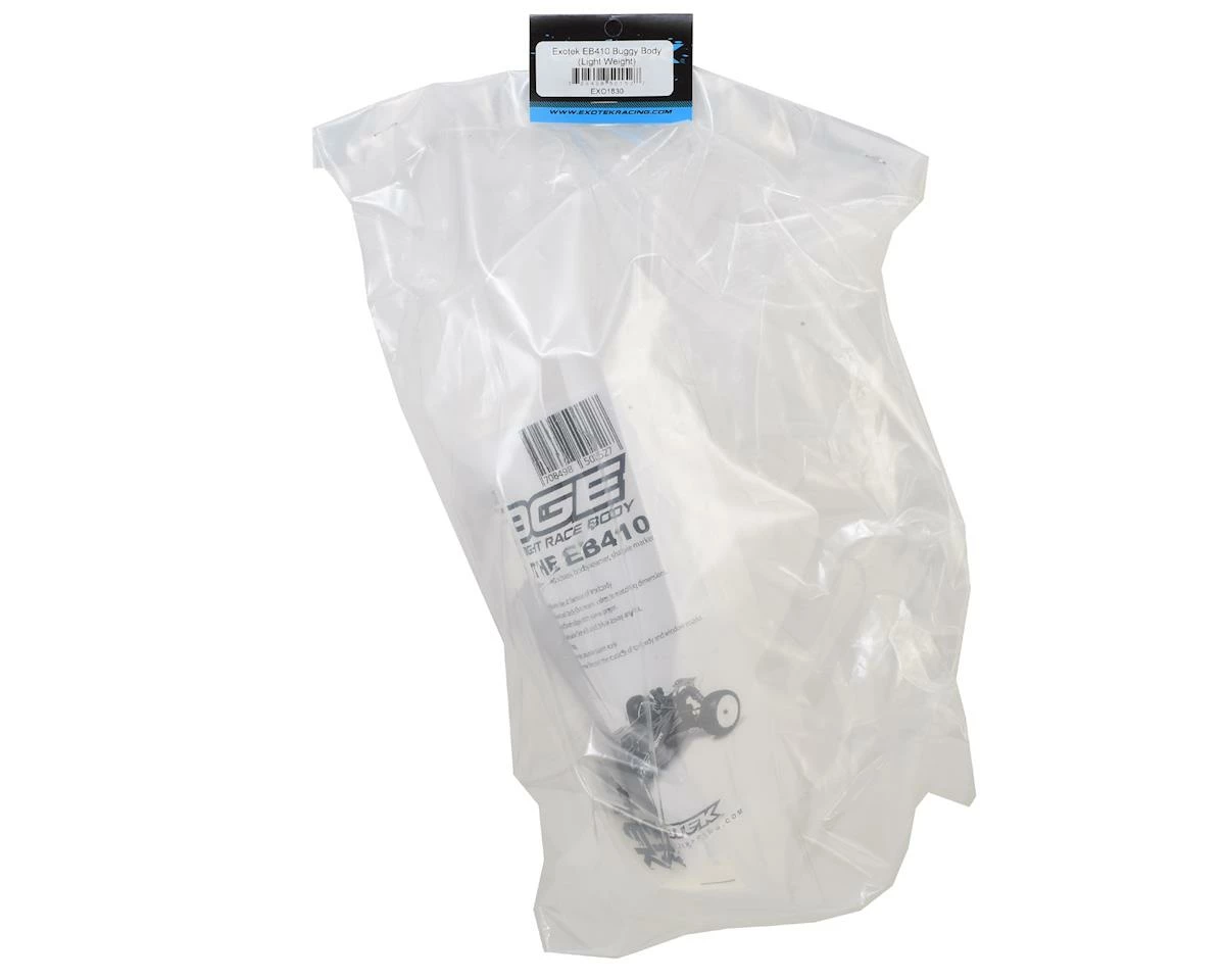 This is the “Lightweight” Exotek EB410 1/10 Buggy Body. Crafted to greatly lower the looks and cg over the stock body, the EDGE body sits 8mm lower than the stock body. Exotek has also taken great care to still allow the mounting of the fan above the motor and still allow normal height or low profile servo use. Clean lines are used throughout for a clean ‘aero’ downforce package yet allows easy custom painting thanks to the smooth and rounded corners.