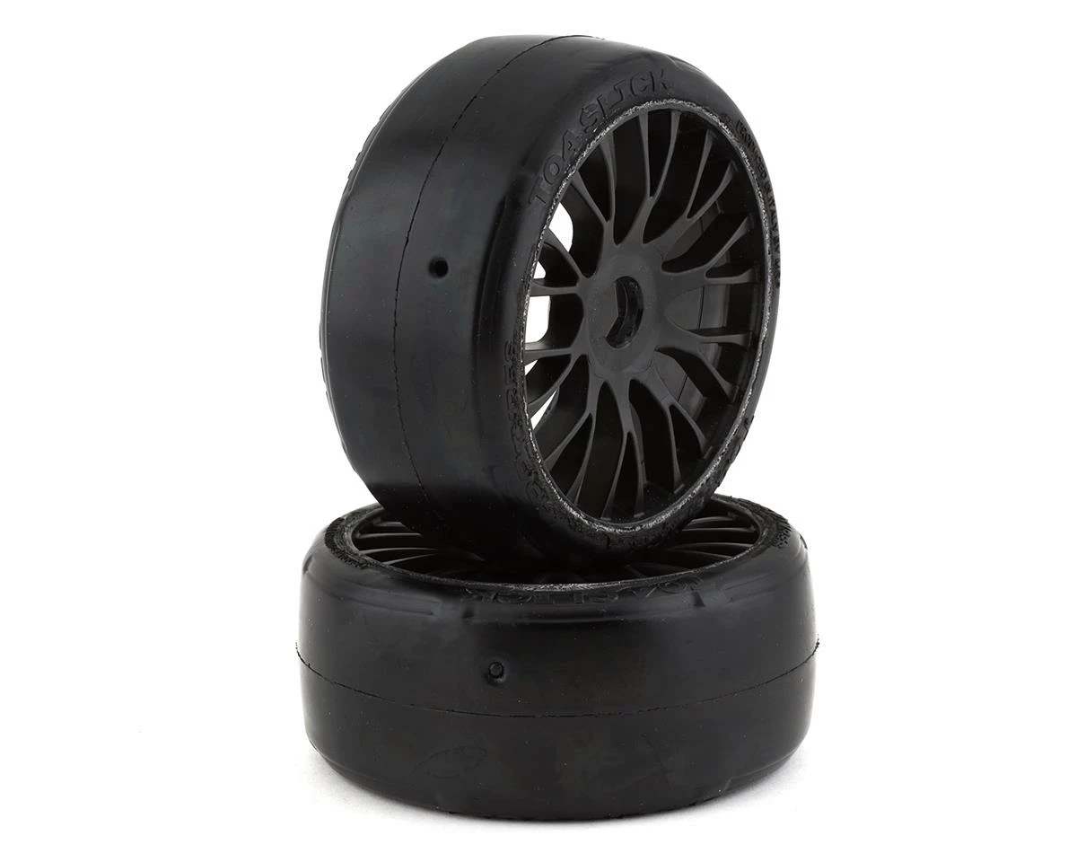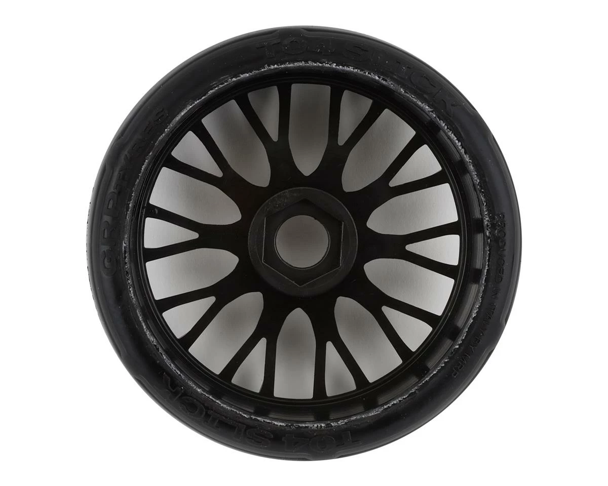 GRP GT – TO4 Slick Belted Pre-Mounted 1/8 Buggy Tires. These tires are mounted on black GRP 20 spoke FLEX wheels.