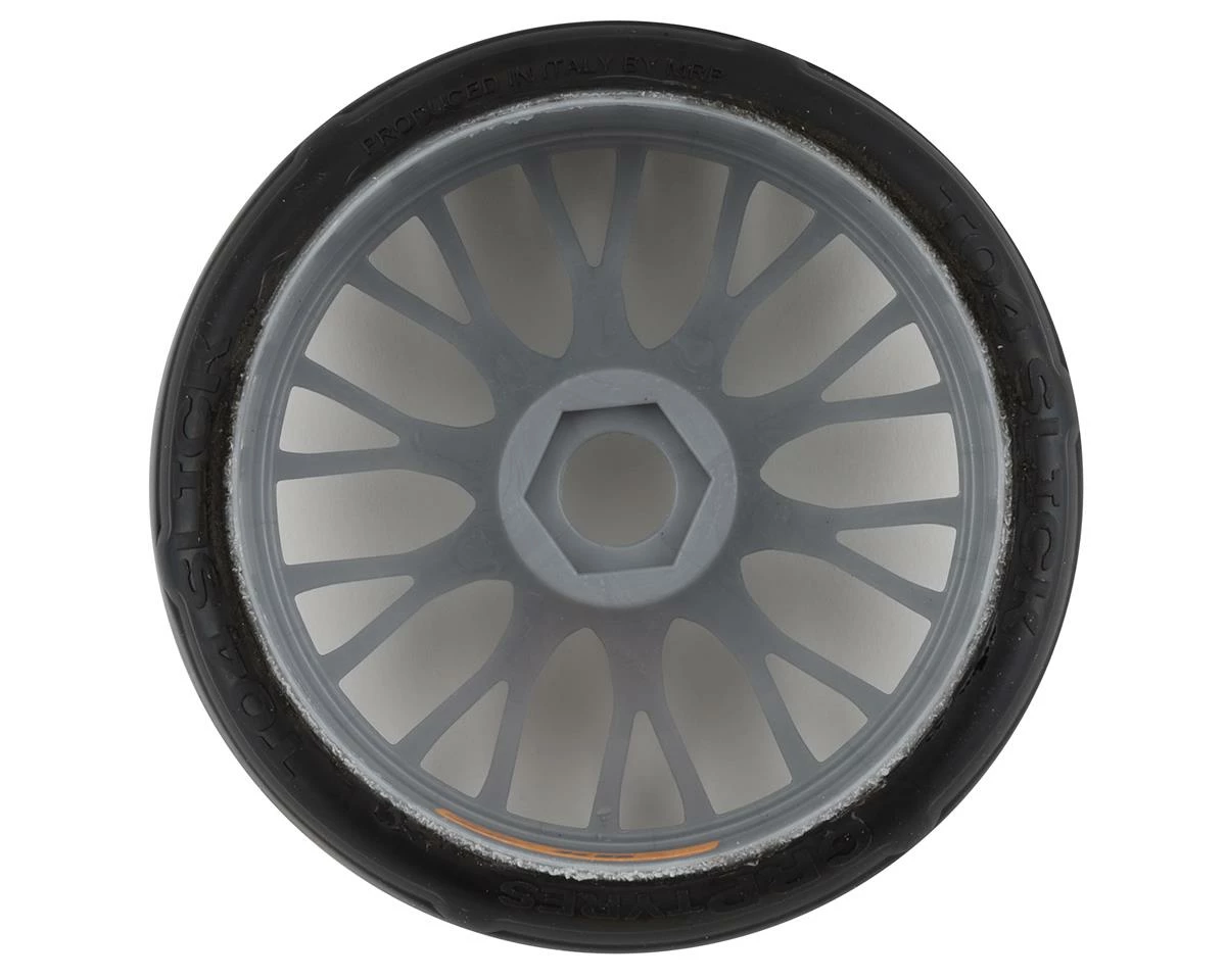 GRP GT – TO4 Slick Belted Pre-Mounted 1/8 Buggy Tires. These tires are mounted on silver GRP 20 spoke FLEX wheels.