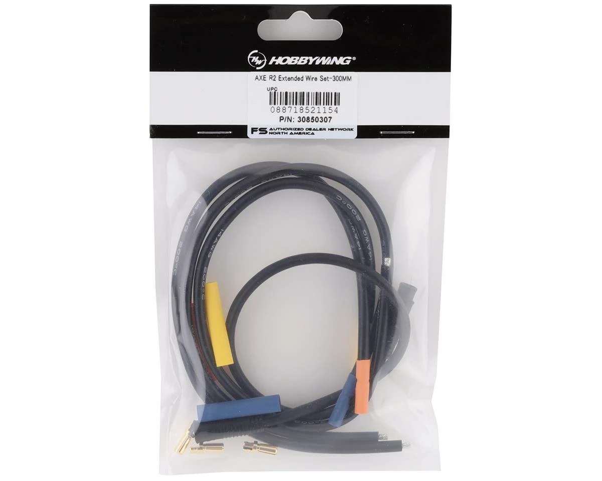 Hobbywing 300mm AXE FOC R2 Extended Wire Set. Package includes extended motor wires and sensor wire, as well as male bullet plugs and heat shrink.Â