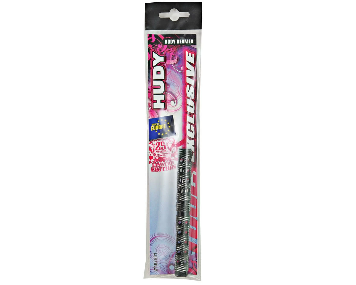 This is the Hudy Limited Edition Body Reamer. This super-lightweight, professional-quality reamer for lexan bodies cuts perfect holes from 0-9mm (0-0.35”) with special CAD-designed cutting blades. The blades are hand-ground on a specially-modified grinding machine for maximum sharpness and lifespan. Laser-engraved measurements in both Imperial and Metric sizes indicate the hole size while reaming, making it easier to make precise holes. The CNC-machined Swiss 7075 T6 aluminum handle features a diamond pattern surface for unsurpassed grip, while the handy aluminum cover protects the blade. The handle includes a black plastic cap that is press fit into the handle end. Optional color-coded plastic caps (violet, red, blue) are available to customize the tools to your specifications.