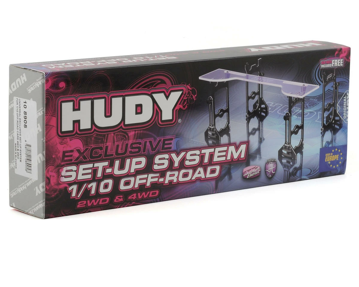 This is the Hudy Universal Exclusive Set-Up System, and is intended for use with all 1/10 off road vehciles with 4.7mm wheel axles. This system supports both pin and hex drive type wheel adapters, and is used for super-precise measurement and setting of front/rear camber, toe, steering throw, and caster. Backlash-free, wobble-free mounting of the full ball-bearing equipped set-up stands (12 high-precision ball-bearings) provides ultra-smooth, ultra-precise movement and operation.  Â