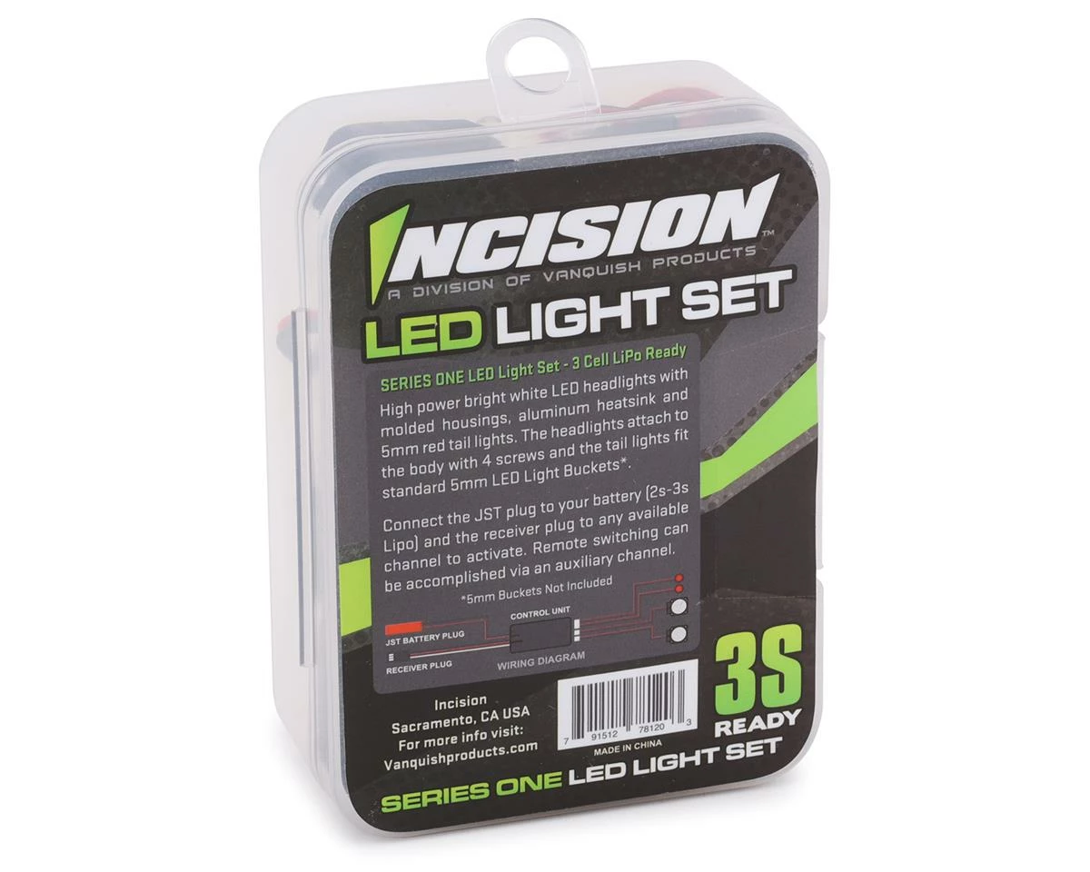 The Incision Series 1 Light Kit is a high power LED kit that is ready to be installed in your VS410 Origin and Origin Halfcab bodies, as well as other bodies that accept “Q” style light buckets. The light buckets feature a heatsink on the back side to dissipate heat and provide a long life. These LED’s are 3S ready and will light up the trail on night crawls.