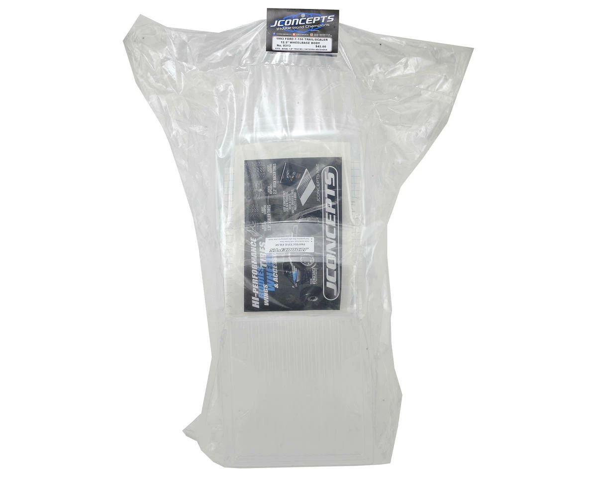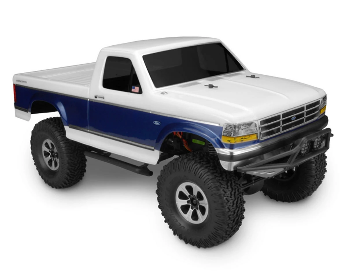 The JConcepts 1993 Ford F-250 Trail/Scale Body is an officially licensed version of the classic Blue Oval truck. For the ninth generation F-Series, the design was given another major upgrade. To further improve its aerodynamics, the forward bodywork was given a slightly lower hoodline, rounding the front fenders and grille. The “Blue Oval,” a trademark of all Ford pickups, makes a striking appearance centered in the grille. Stout fender flares are carved ever so carefully in to the panels while openings allow for a vast assortment of tires on the market. The F-250 single-cab look is strong and is a careful reminder of a time when passengers sat side-by-side during a typical outing.