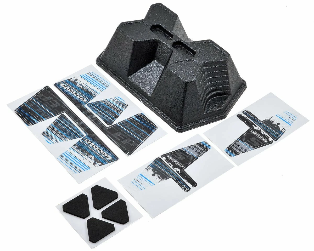The design team focused on several aspects and size was of utmost importance. A lower stance was built into the design and the smaller foot-print occupies minimal space in the pits. Top load pockets were incorporated as catch-all compartments for body clips, wheel nuts or any small items that are routinely changed during a race event. Triangle cushion pads are positioned on the top to provide support all the way to the edges on any platform vehicle to prevent slippage. JConcepts has included a decal wrap for maximum exposure and presence that resembles the popular chassis tape “Striker” theme.
