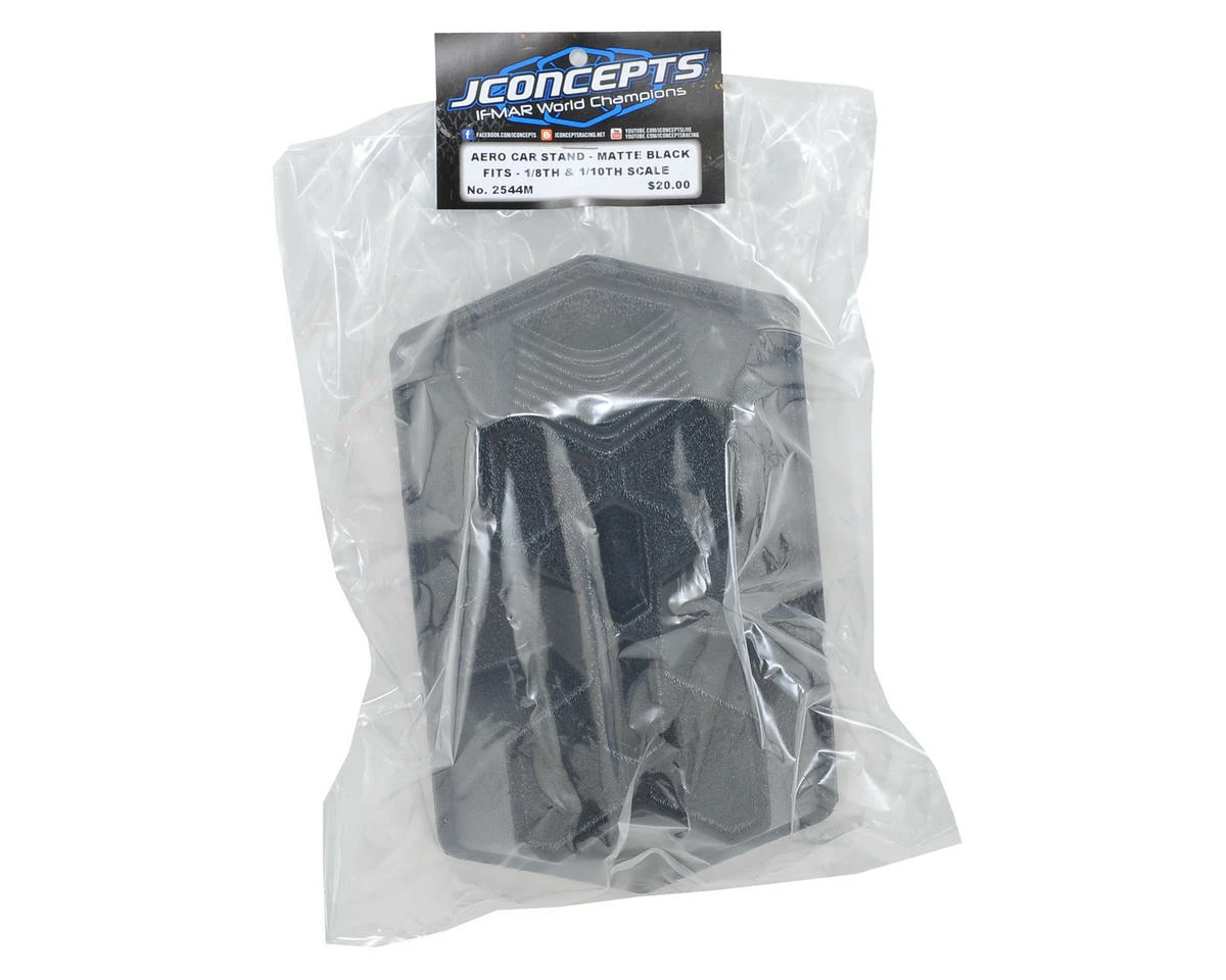 The JConcepts Aero Car Stand is the perfect compliment to your 1/10 or 1/8 scale vehicle. The Aero car-stand in matte black material stands out in any pit area and supports the vehicle with its unique footing and highly chiseled shape. A rail-like border contains the shape while a deep draw along the sides creates a bold surface for included decal or custom wrap. A “V” step-down feature was added to the ends which brings the styling back down to earth while the void creates added space below the vehicle.