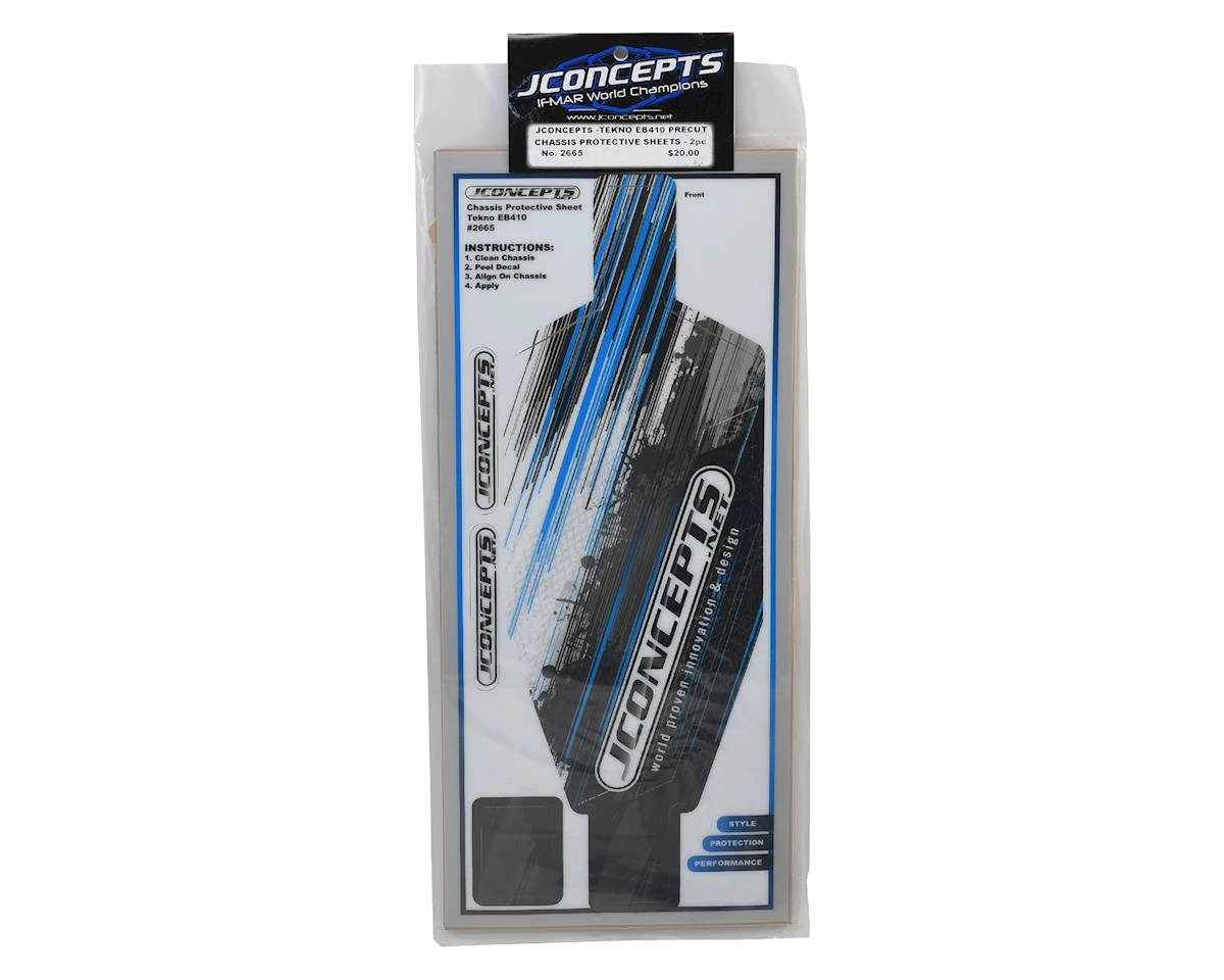 The JConcepts Tekno EB410 Precut Chassis Protective Sheet helps to protect your chassis and provide a smooth or slick surface to decrease friction between chassis and dirt surfaces. With 2 pieces included per package, the durable and resilient material fits each chassis layout like a glove and adds protection and style in one easy package. The application was slightly different on the Tekno EB410 vehicle because of the low ground clearance and suspension design of this high-speed vehicle.