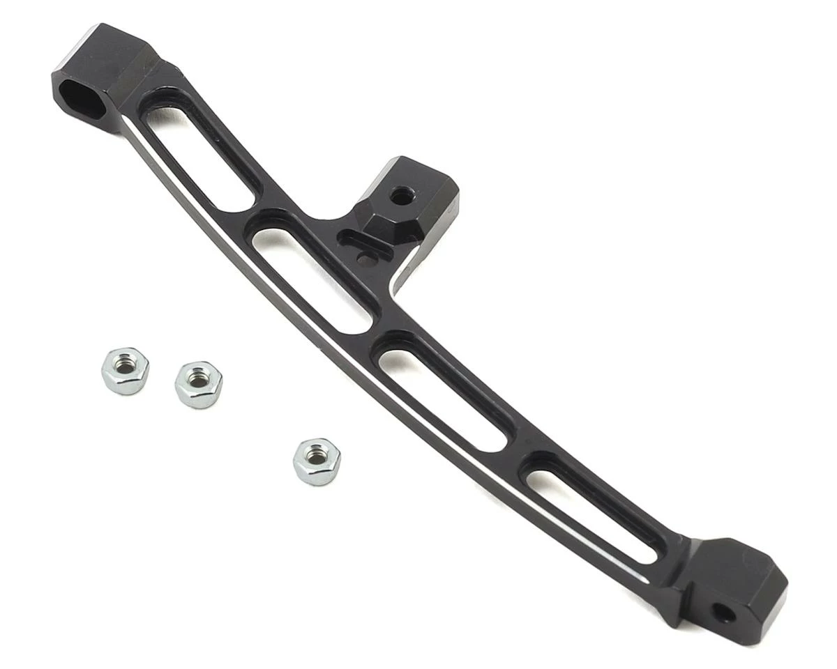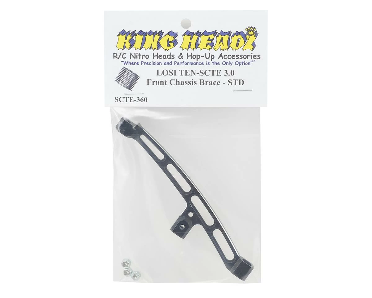 The King Headz TLR TEN-SCTE 3.0 Front Chassis Brace replaces the stock brace with a CNC machined 7075 aircraft grade aluminum upgrade. Anodized in a stealthy black finish, this brace features machined pockets to capture the lock nuts and was designed to increase rigidity and add strength.