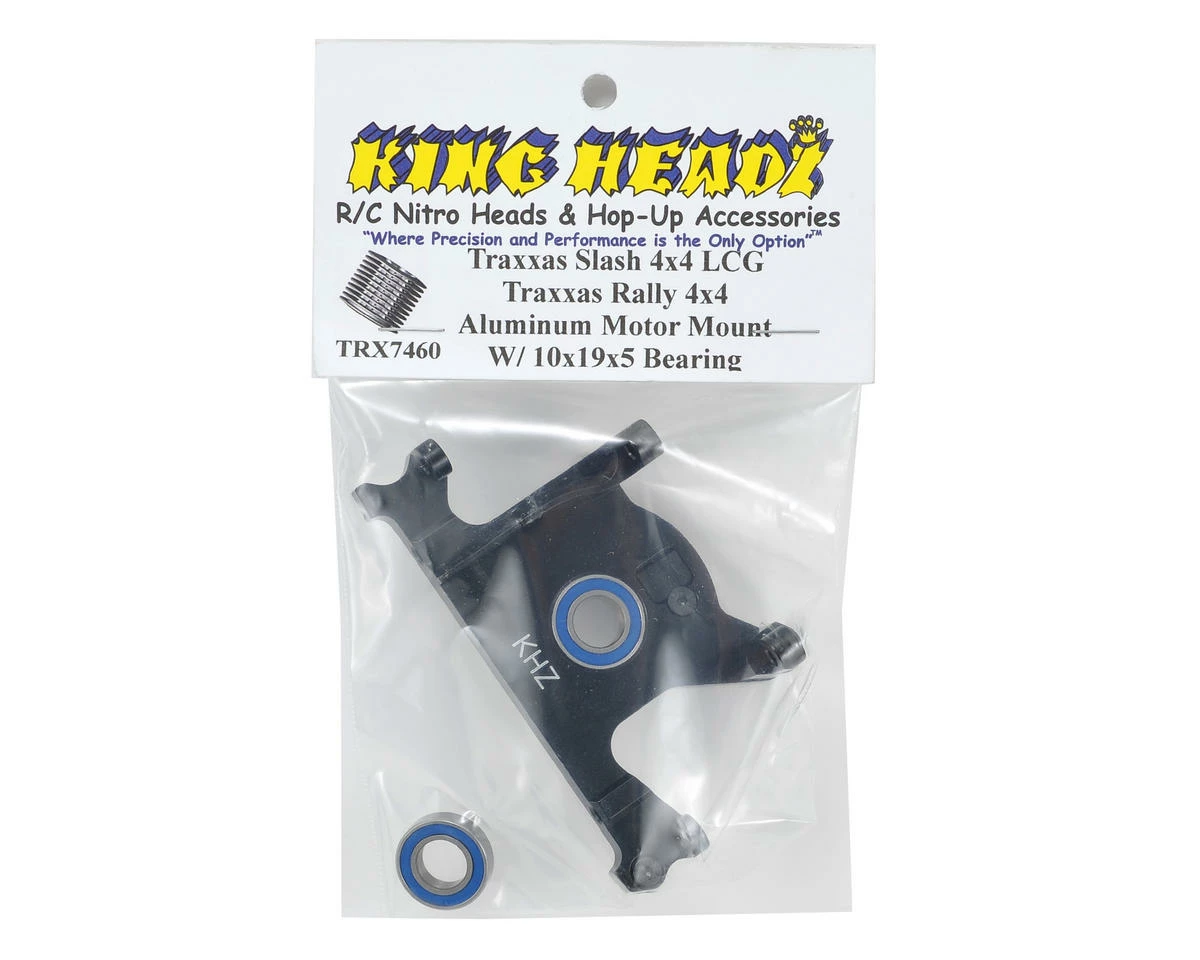 This is an optional King Headz Aluminum Motor Mount, and is intended for use with the Traxxas Slash 4×4 LCG and Rally vehicles. This motor mount has been CNC machined from 7075 grade aluminum and anodized black. This upgrade part is a direct replacement for the plastic TRA7460 motor mount and has been designed to work directly with either the slipper or center differential. Additionally, the mount uses a 10x19x5 bearing which is much stronger then the stock 10x15x4 bearing for increased durability and bearing life.