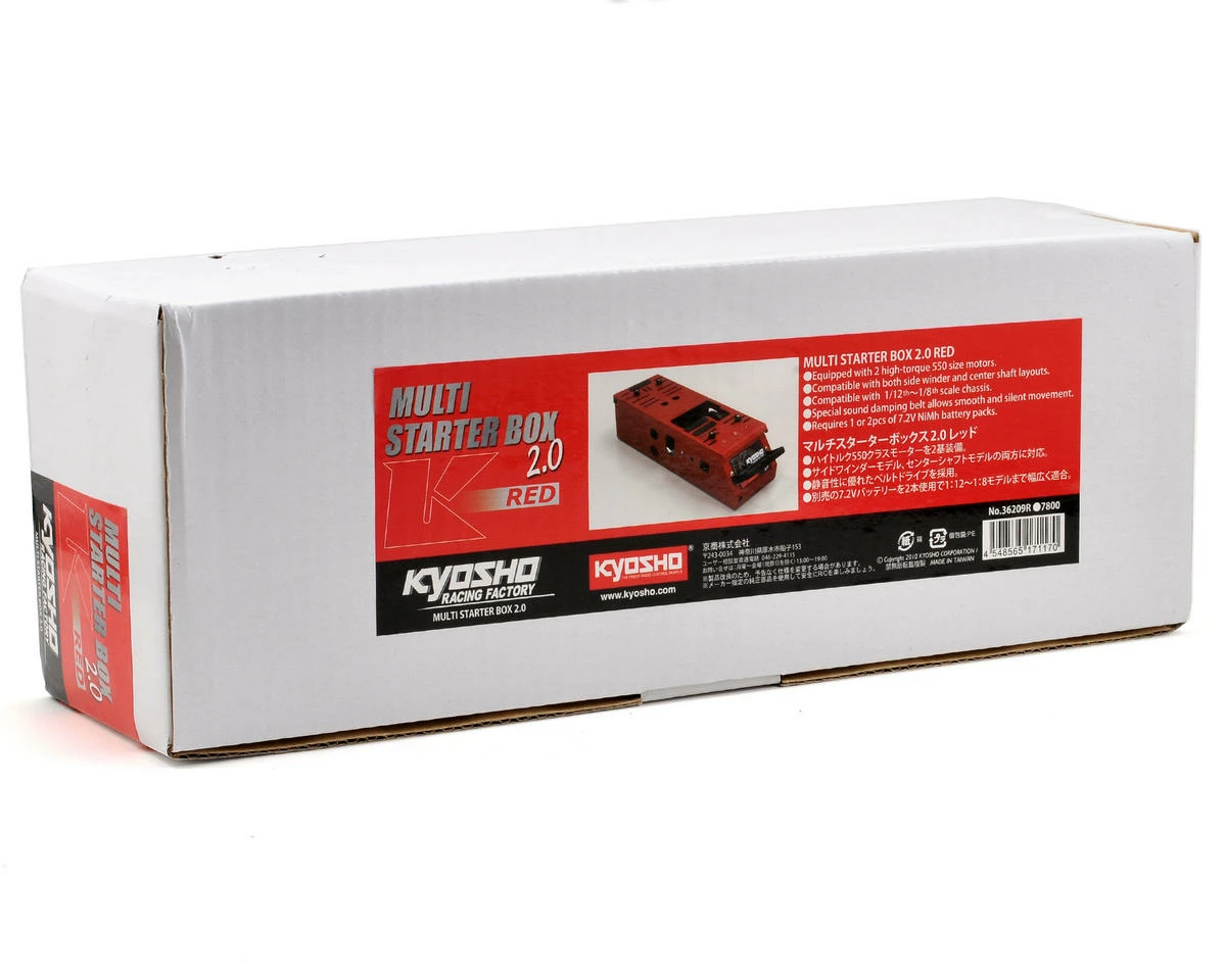 The Kyosho Multi-Starter Box 2.0 features dual fan cooled, high torque 550 motors with a belt driven gear reduction. This gives it exceptional torque for starting even the most stubborn nitro engines fresh out of the box. This design produces more useful torque than single motor boxes with gear reductions, and especially more torque than big direct drive starter boxes with freakishly large motors. They are impressive looking, but they produce very little torque and they are difficult to use. Combined with a 55mm hard rubber starter wheel which is much smaller than those in most boxes, not only does it produce even more torque, the starter wheel is able to reach higher up into the chassis opening, allowing the Multi-Starter 2.0 to start a wider variety of engines over a larger range of installations than any other starter box. Lastly, the Multi-Starter includes instructions for pin placement on top of the box to accommodate a majority of the vehicles in the Kyosho line up, as well as vehicles from a variety of brands.