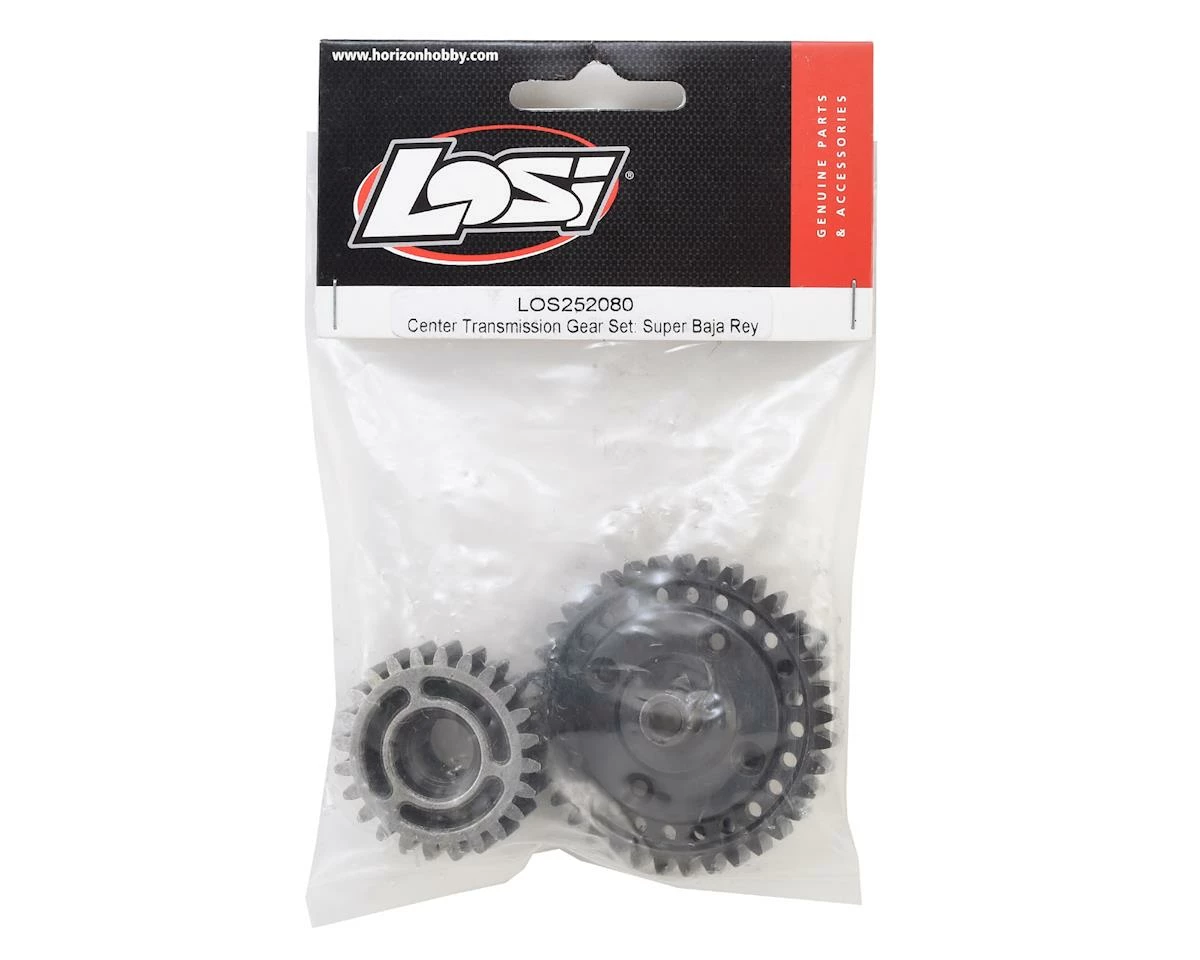 Losi Super Baja Rey Center Transmission Gear Set. This is the replacement center transmission gear set. Package includes one large gear, one 2-in-1 gear and one gear shaft.