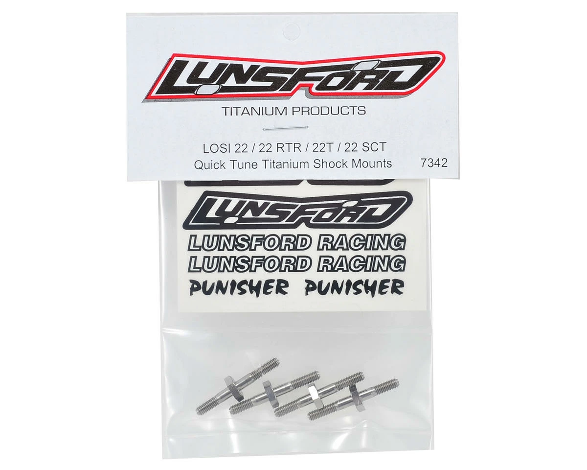 This is an optional Lunsford “Quick Tune” Titanium Shock Mount Kit, and is intended for use with Losi 22 1/10 buggy. Lunsford Quick Tune titanium shock mounts were invented by racers for racers, and are geared towards the hardcore ‘tuning’ enthusiast. By removing just one nylock nut, the shock can be quickly moved to any shock tower position. The quality is the same as for all Lunsford parts. Precision CNC machined from domestic 6AL/4V titanium to exact tolerance. These shock mounts have been around since the mid ’90s and if you’re a diehard tuner, these are highly recommended.