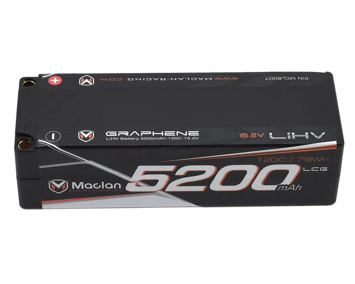This is the Maclan LCG Graphene 4S Carbon 120C Race Formula LiPo Battery with 5200mAh of capacity. The Maclan Racing Race Formula Graphene battery is the latest 2018 chemistry that provides lower weight with better discharge curves. The new Graphene 120C LiPo batteries are the one in the evolution of LiPo battery technology. It offers lower operating temperatures, lower internal resistance, better run time, increased cycle life and voltage!