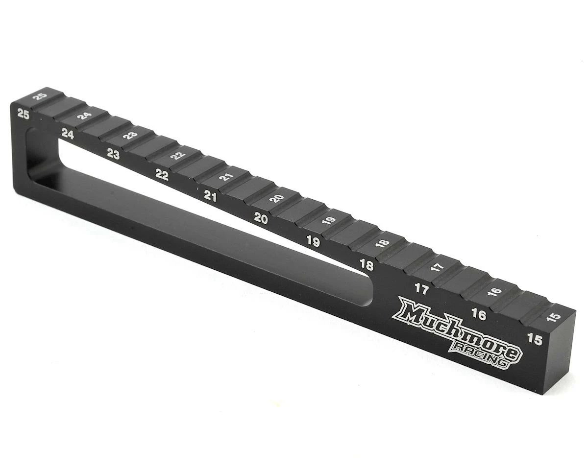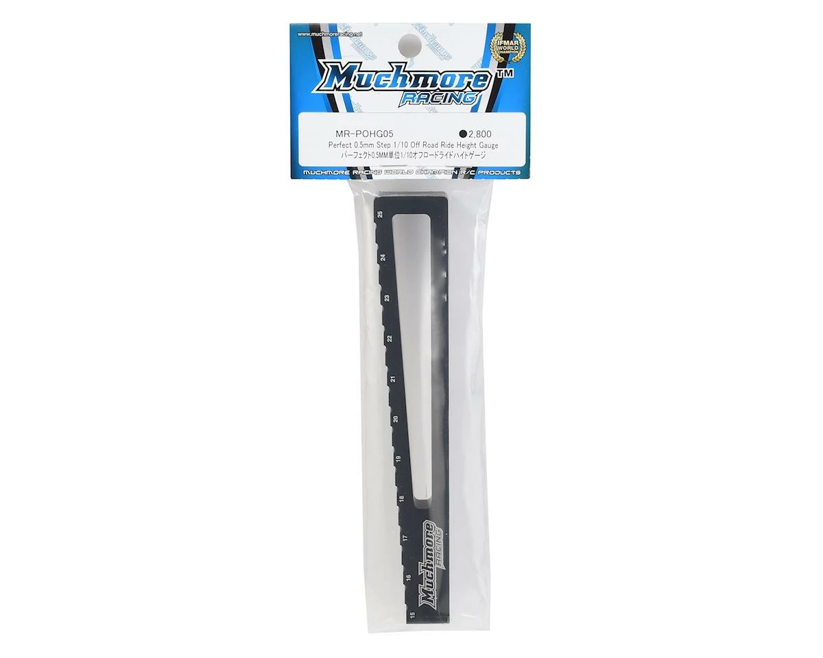 The Muchmore Racing Perfect 0.5mm Step 1/10 Off Road Ride Height Gauge is a precision machined gauge that will allow you to measure between 15mm and 25mm settings in .5mm increments.Â