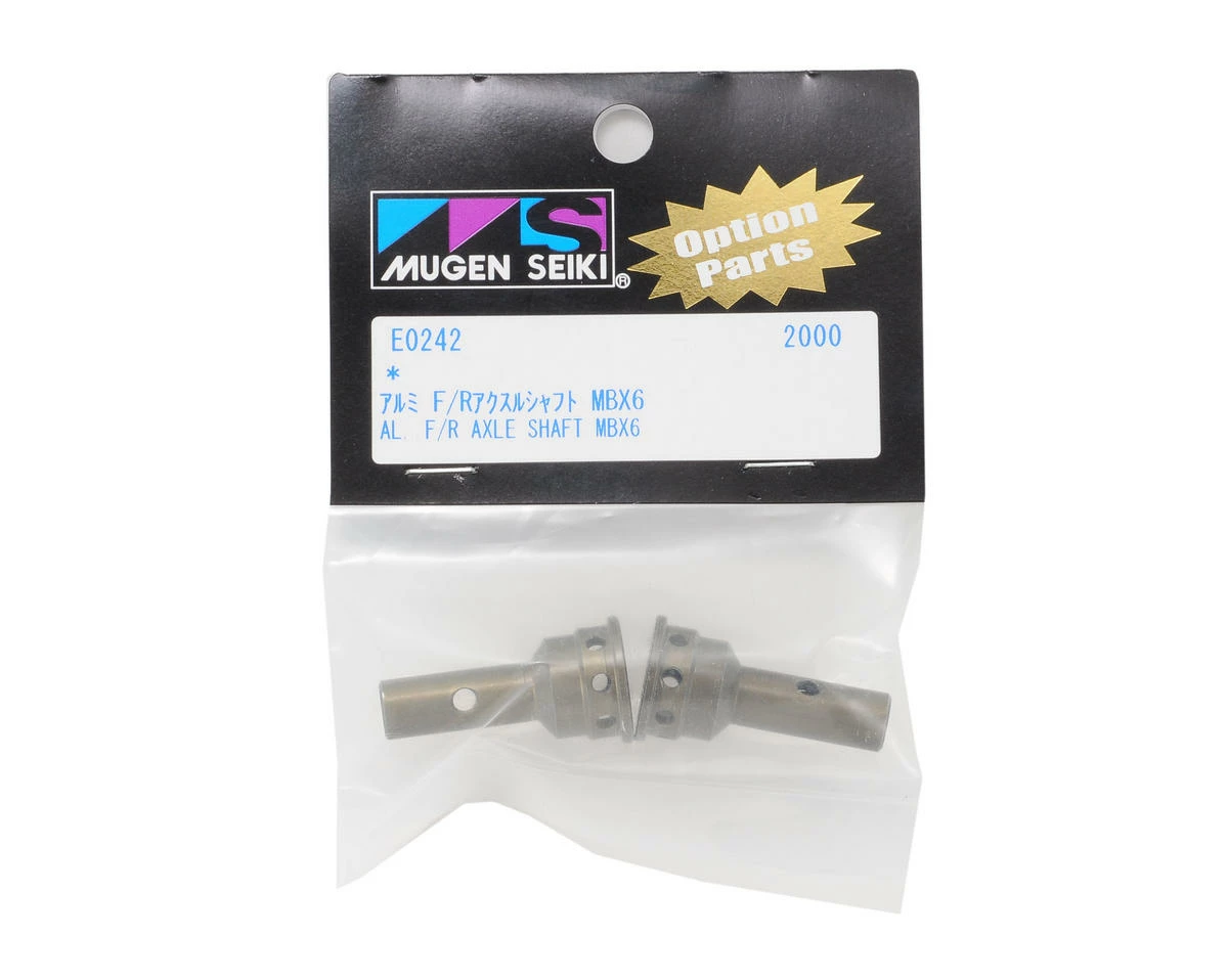 This is a set of two optional Mugen aluminum front or rear axle shafts, and are intended for use with the Mugen MBX6 and MBX6T 1/8 scale vehicles. Option parts from Mugen Seiki Racing will help reduce the drive train weight and increase power response for the MBX6.