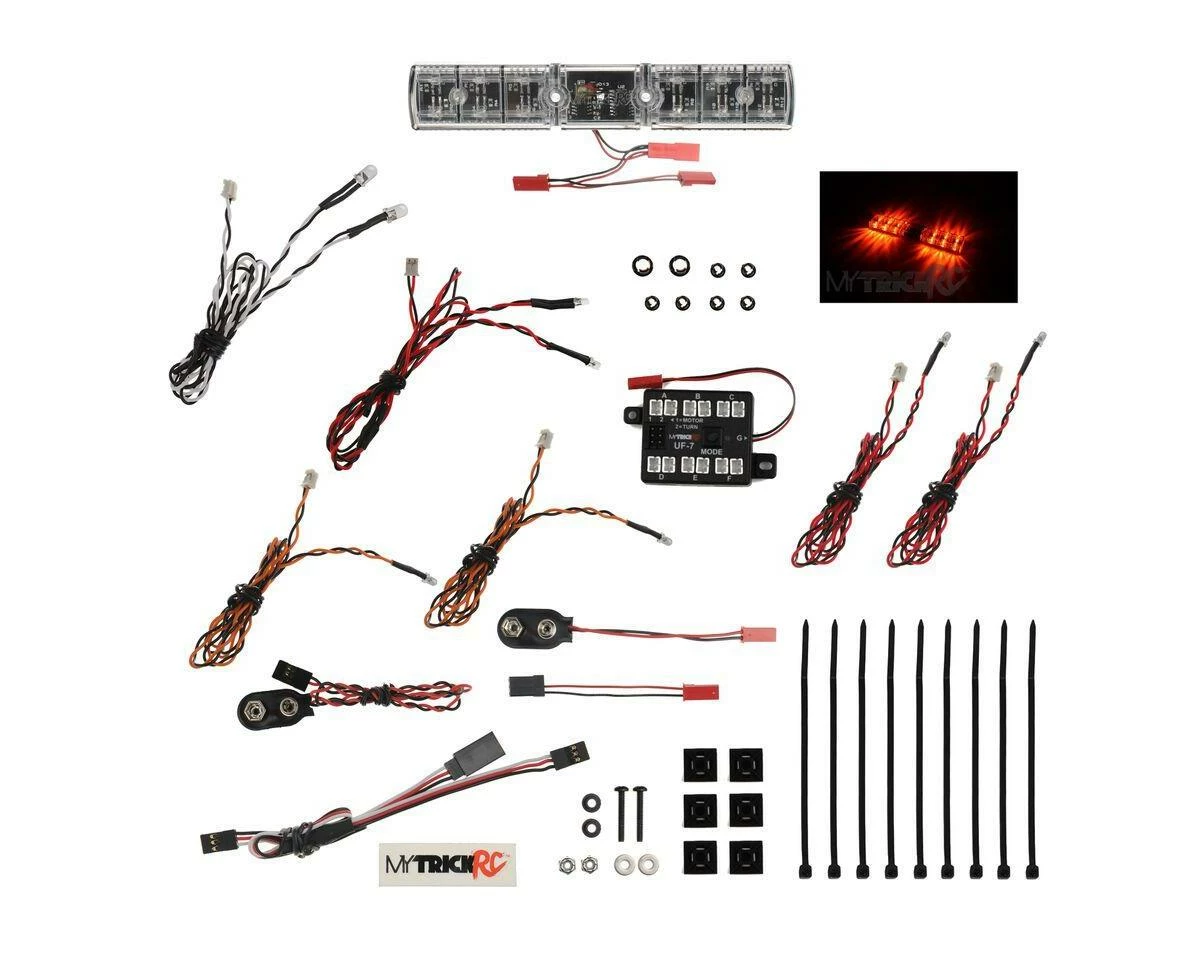 The MyTrickRC Utility Deluxe Light Set gives you the lights you need to finish off your pace car, tow truck, or other emergency vehicle build. The MyTrickRC Utility Deluxe Light Set provides the lights needed to outfit your vehicle’s front and rear bumpers with headlights, tail lights, body strobes, and flasher bar.