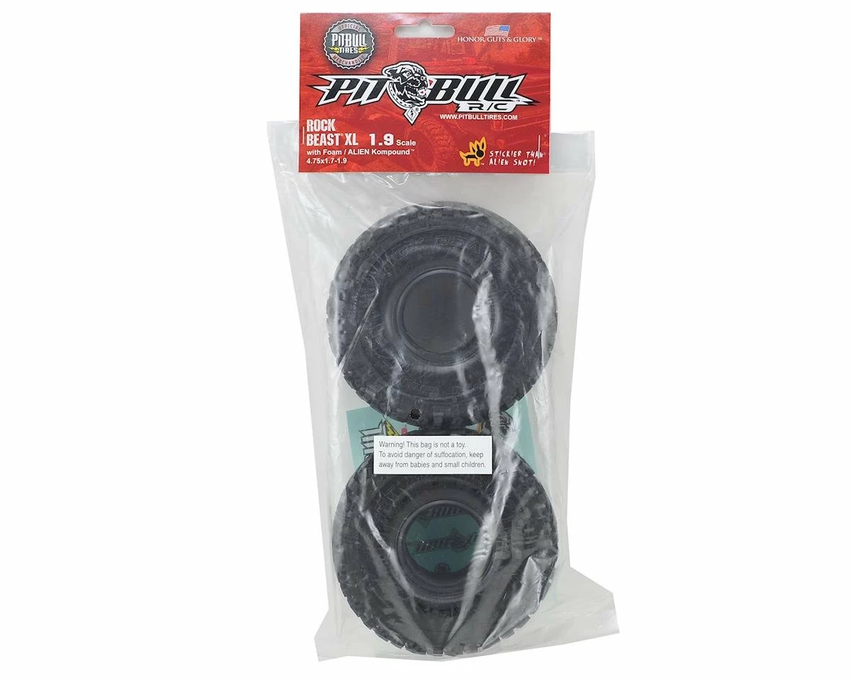 This is a pair of Pitbull 1.9″ Rock Beast XL Crawler Tires. The Rock Beast XL is similar to the original Rock Beast but now sports a larger size for guys wanting tall 1.9 tires. The extra size from the XL’s put them at the max 4.75″ diameter; the originals on the other hand stand at 4.45″.