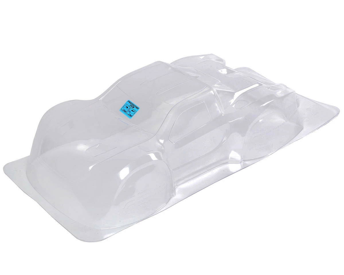 This is the Pro-Line EVO SC Body. After years of developing race winning bodies for Short Course trucks with advanced aerodynamic features, Pro-Line has unleashed the next Evolution of performance. The EVO SC body is designed with an aggressive sloped nose which keeps as much air as possible from getting under the hood; this decreases the dreaded parachute effect and gives you more control of your SC truck. The improved front down-force also enhances steering for quicker lap times. Pro-Line incorporated the maximum amount of vents possible in the rear of the body, in order to reduce drag, rear lift and weight as much as possible, while still maintaining long-lasting durability. All of these features add up to the most advanced Short Course Race Body ever constructed.