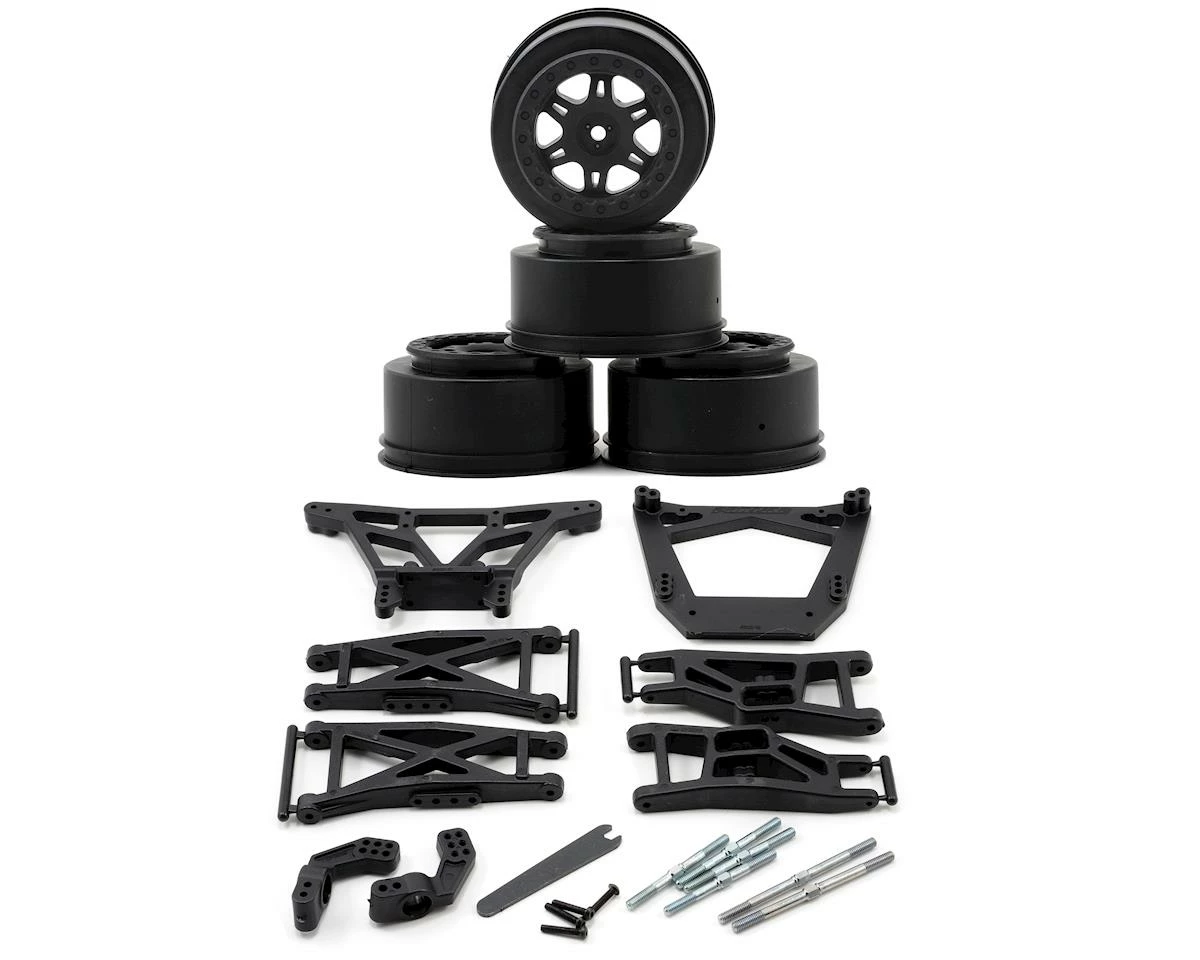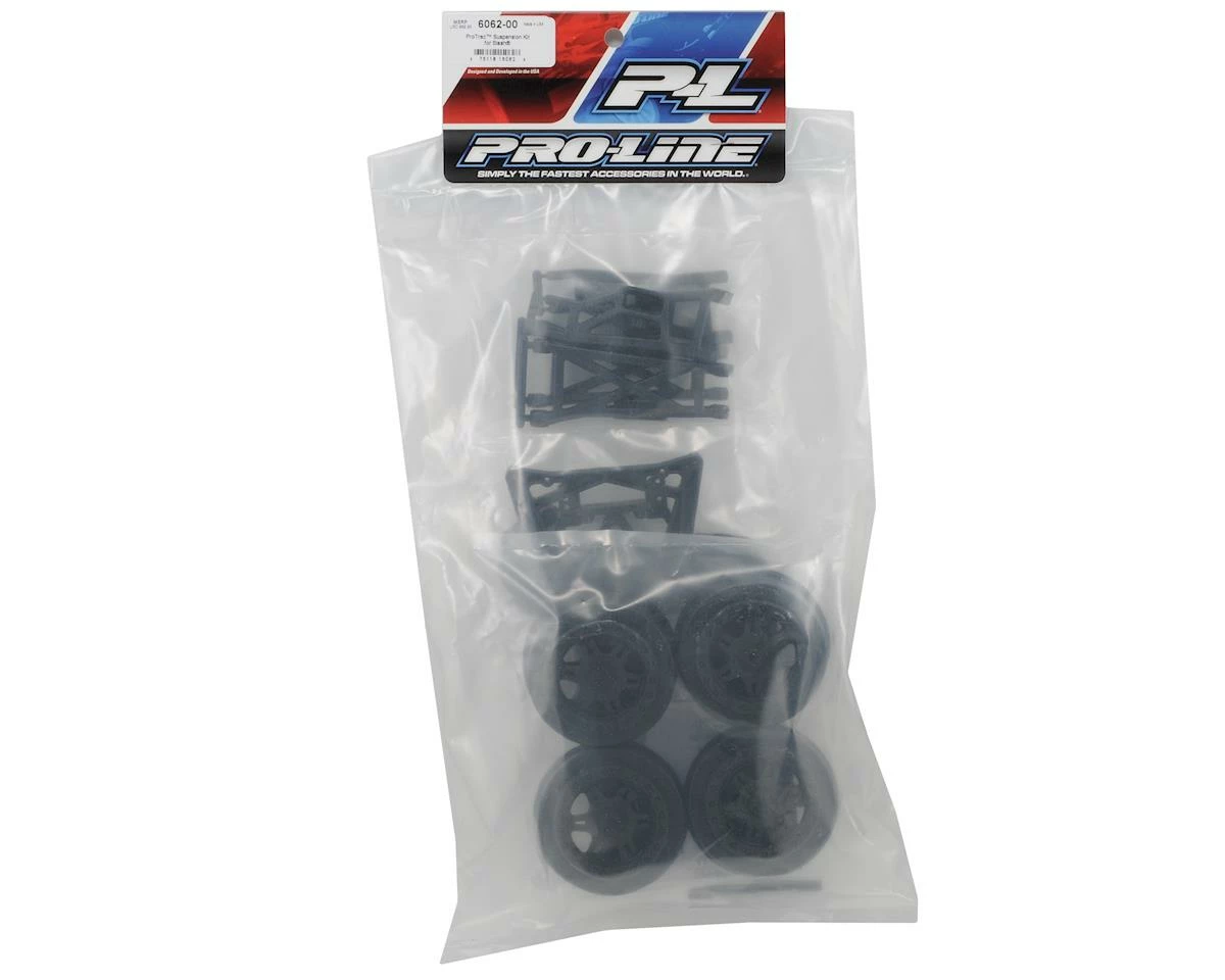 This is the optional Pro-Line ProTrac Suspension Kit, and is intended for use with the Traxxas Slash short course truck. The ProTrac Suspension Kit features a race inspired design that uses 10mm wider suspension arms for the best combination of light weight and durability, and uses a dedicated -10mm Offset Split Six wheel to bring the track width back to stock specifications. Ultra durable rear hub carriers that are stronger than the stock parts, offer new camber and roll center positions for a greater level of adjustability. The shock towers provide correct shock progression and increased stability. The front and rear shock towers offer 3 camber locations, and two shock positions, as well as a high performance appearance.
