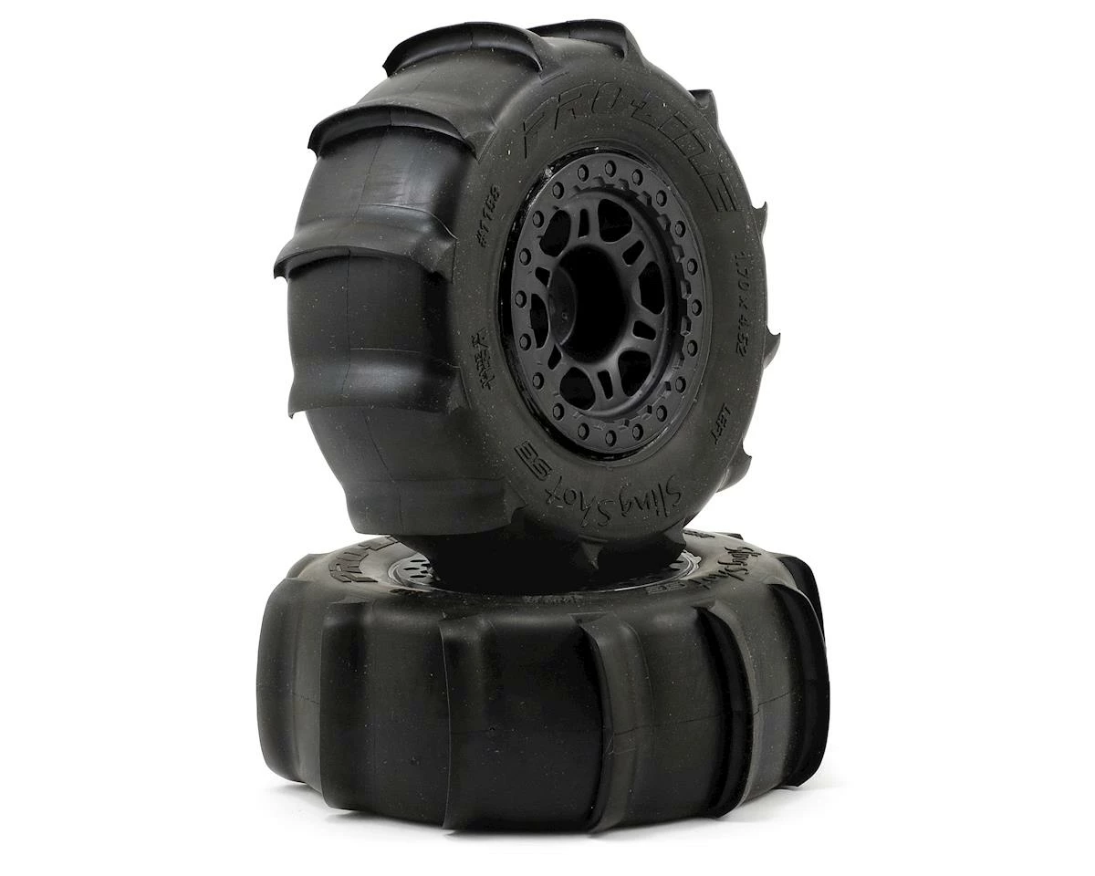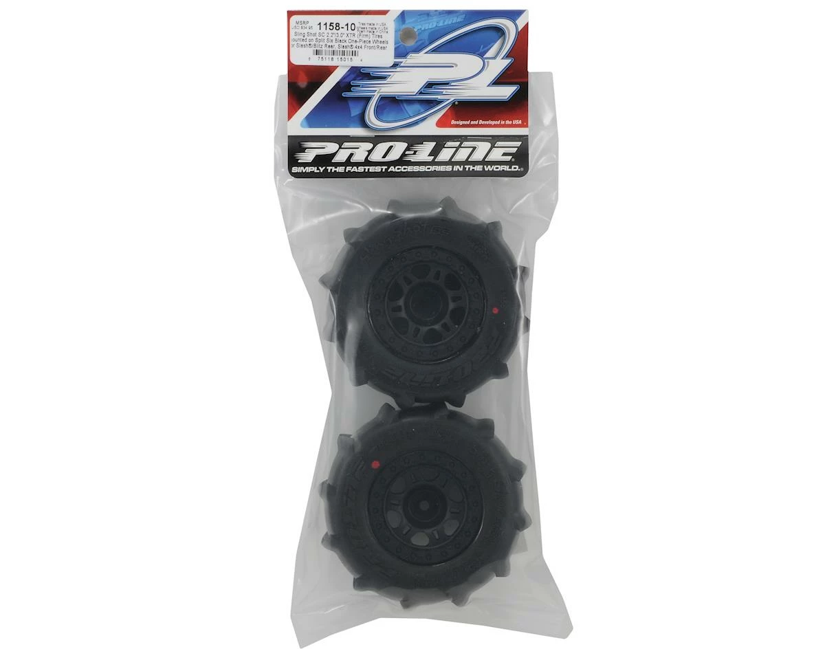 This is a set of two Pro-Line Sling Shot SC 2.2/3.0 Tires premounted on Split Six one-piece wheels and are intended for use on the front or rear of the Traxxas Slash 4×4, and Slayer, as well as the rear of the Slash and HPI Blitz short course trucks. Turn your Short Course into a sand slinging super truck with Pro-Line Sling Shot SC tires. With 10 monster grabbing ¼” tall paddles sand and snow are easily overcome.