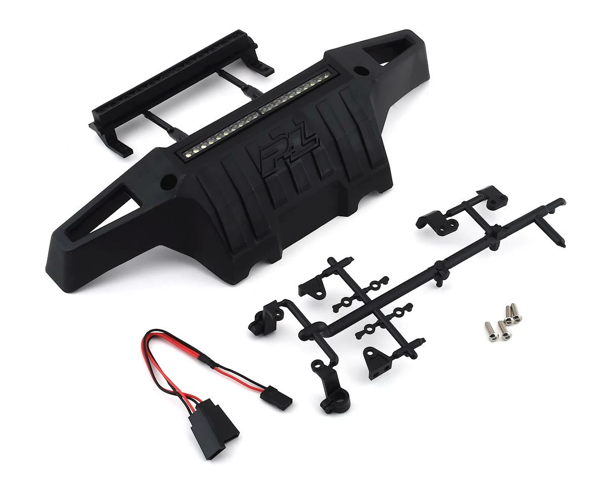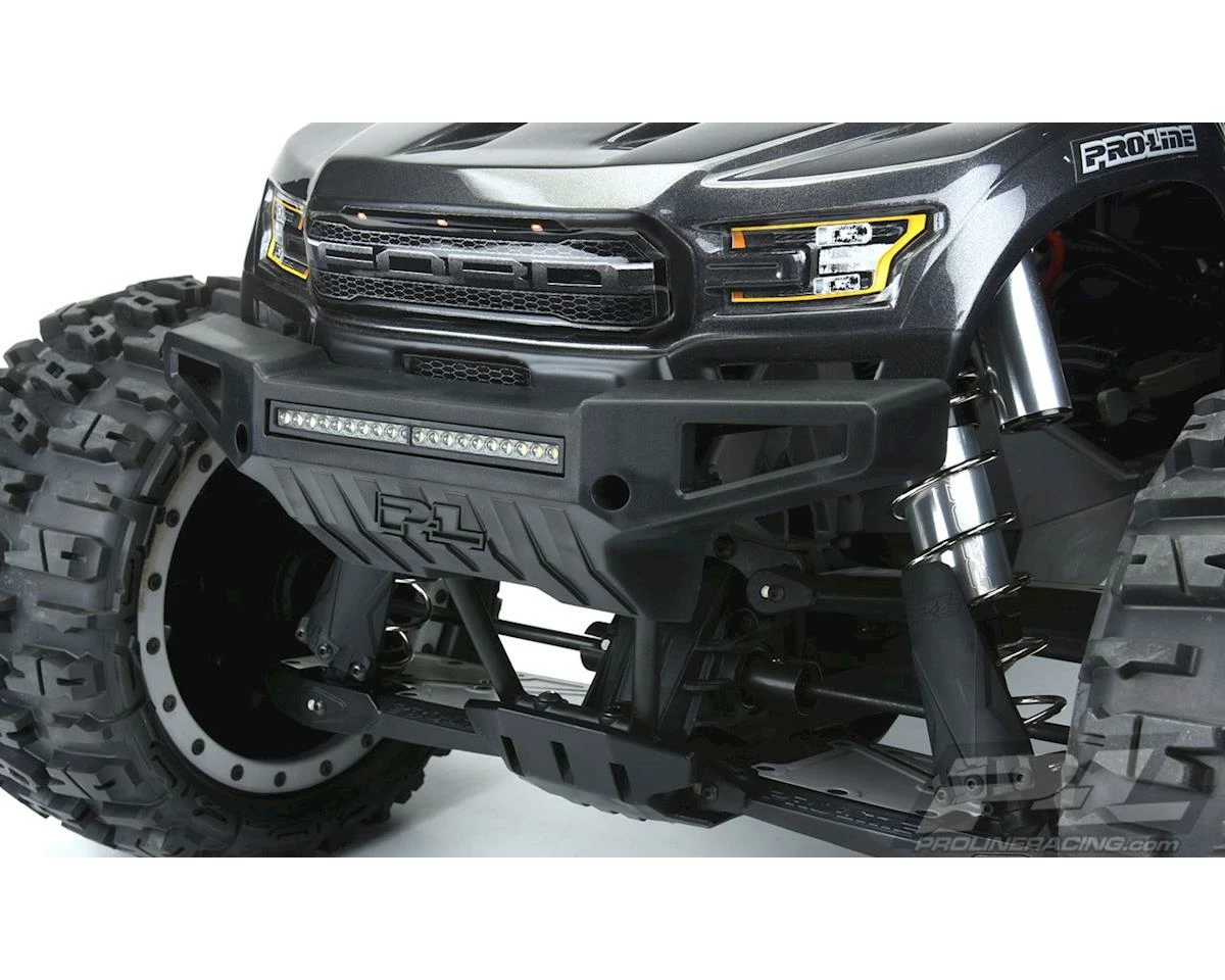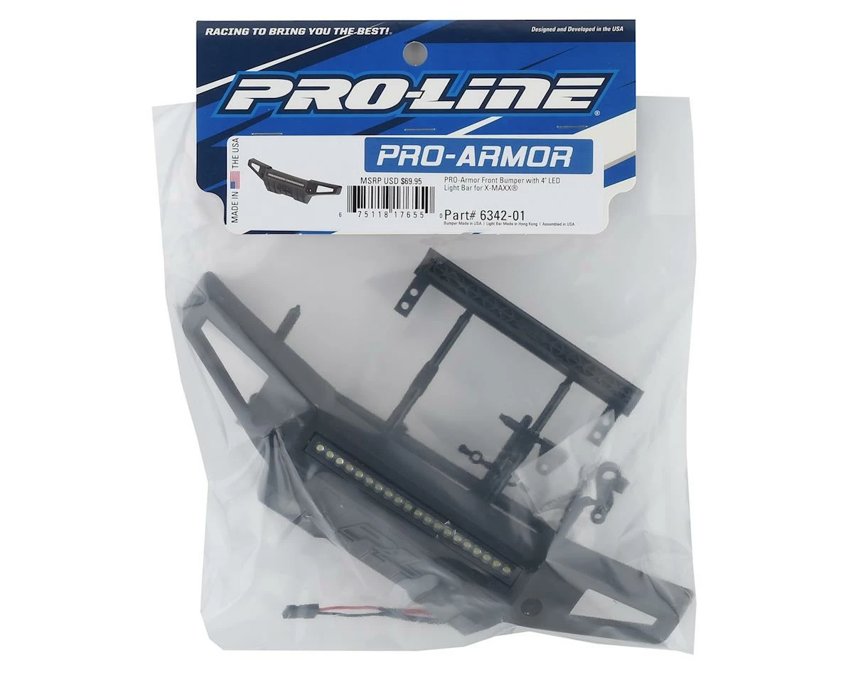 This optional Proline X-MAXX PRO-Armor Front Bumper with 4″ LED Light Bar Mount is a great way to add scale style to your X-MAXX while also adding some serious protection. This LED integrated bumper kit is designed to truly enhance your kits scale appearance, functionality, and performance. Pro-Line’s 4″ Super-Bright LED Light Bar is included to bring your kit to the next scale level.
