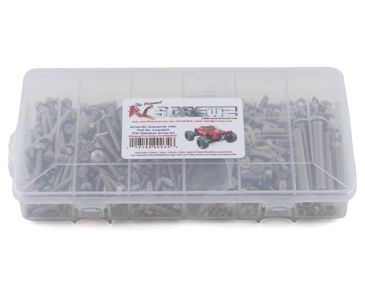 This is a optional RCScrewz Stainless Steel Screw kit for the Arrma Outcast 8S. RCScrewz Stainless Screw Kits are 100% complete. Your screw kit will include everything needed to do a full conversion and more. Stainless Steel Screw Kits are far superior to the screws that come stock with your RC. RCScrewz kits are made with the best stainless steel money can buy. No more bent, rusted, or corroded screws. Never worry about stripped heads again. You will not find a better screw kit for your RC at any price and RCScrewz Guarantee’s it. If for any reason your not 100% satisfied with your kit, return your screw kit to RCScrewz and they will send you a full refund for the price of the kit.Â