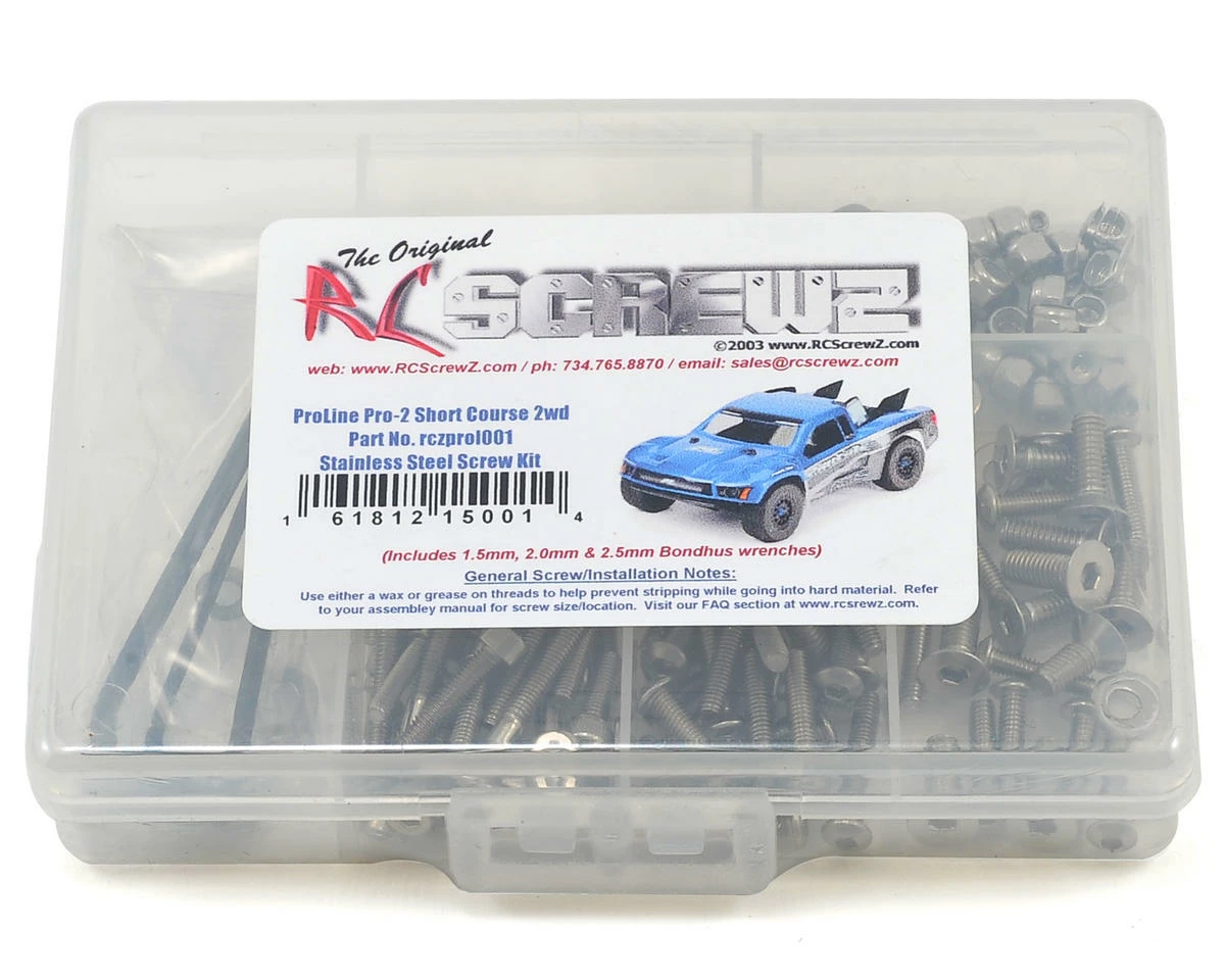 This is an RCScrewz Pro-Line Pro-2 Short Course Stainless Steel Screw Kit. The RCScrewZ Stainless Screw Kit is 100% complete and includes everything needed to do a full conversion and more. The quality of the Stainless Steel Screw Kits far surpasses any stock screws included with you RC; forget about stripped heads and bent, corroded, or rusted screws. You will not find a better screw kit for your RC at any price and RCScrewz Guarantee’s it. If for any reason your not 100% satisfied with your kit, return your screw kit to RCScrewz and they will send you a full refund for the price of the kit.