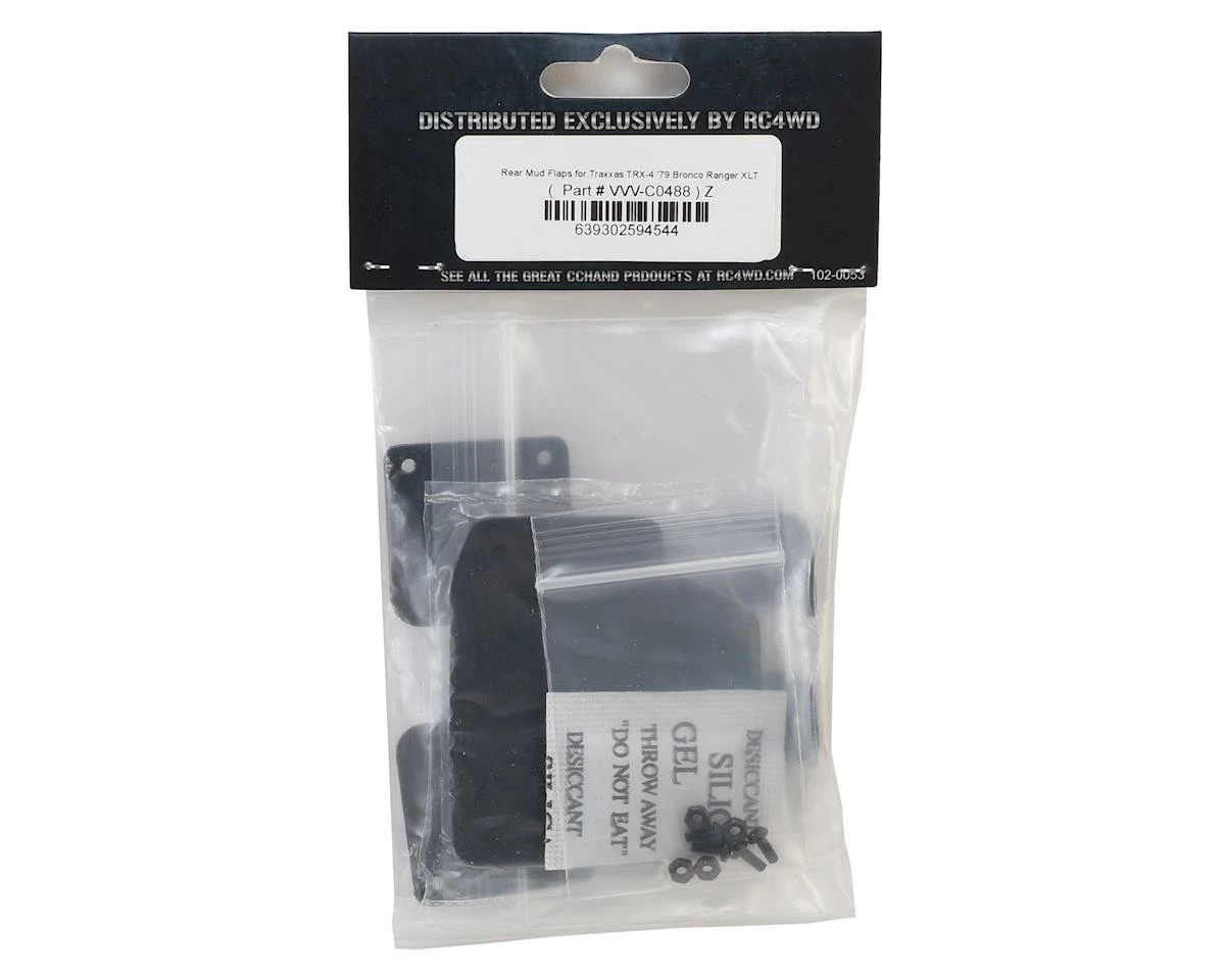 RC4WD CChand Traxxas TRX-4 Ford Bronco Ranger XLT Rear Mud Flaps add realistic details to your Traxxas Bronco. Package includes two mud flaps, install brackets and hardware.