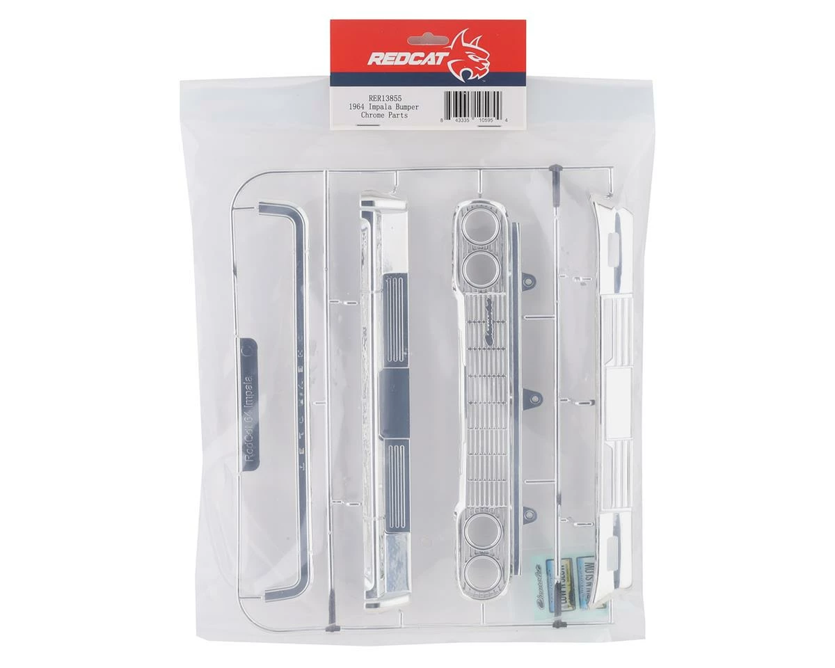 Redcat SixtyFour 1964 Impala Bumper Parts. Package includes replacement grille, license plate decals and bumper components for the Redcat 1964 body.