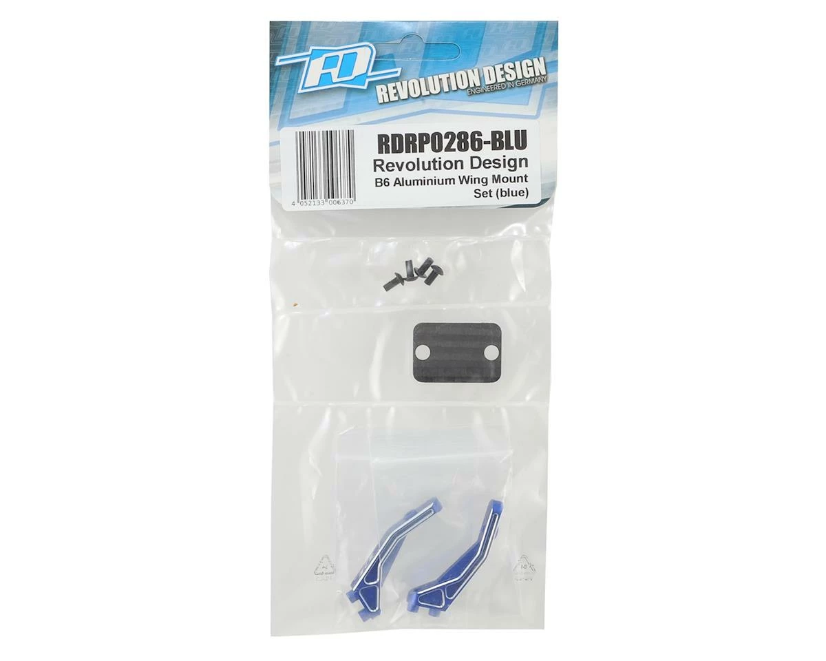 Revolution Design Racing Products B6 Aluminum Wing Mount Set is a direct installation upgrade for Team Associated B6 and B6D buggies. The wing mounts are machined from high-quality 7075-T6 aluminum for improved rigidity and durability, while the anodized surface and silver edge details give your buggy a factory look. The included carbon fiber plate is machined at an angle to allow rear wing angle adjustment to fine-tune the rear downforce. Plus, the large surface carbon plate lets the wing rest on a more sturdy base than common wing mounts, prolonging the wing’s life while also optimising overall downforce. The wing mounts are available in black or blue anodising.