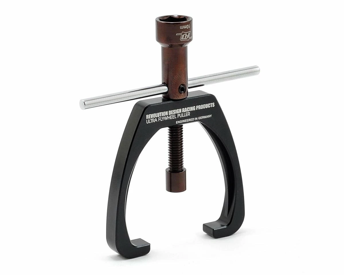 This is the Revolution Design Racing Products Ultra Flywheel Puller. The Revolution Design Racing Products Ultra Flywheel Puller makes maintaining nitro clutches easy. By clamping the black anodised aluminum fork behind the flywheel and turning the shaft the flywheel is pulled away from the crankshaft, eliminating the need to use a hammer or other tools to loosen a tightly fitted flywheel. The Ultra Flywheel Puller is also equipped with a 10mm nut driver that is ideal to tighten the clutch nut after refitting the flywheel. Both the black anodized aluminum fork and the high quality spring steel shaft feature laser etched RDRP logos for a factory look and easy identification.