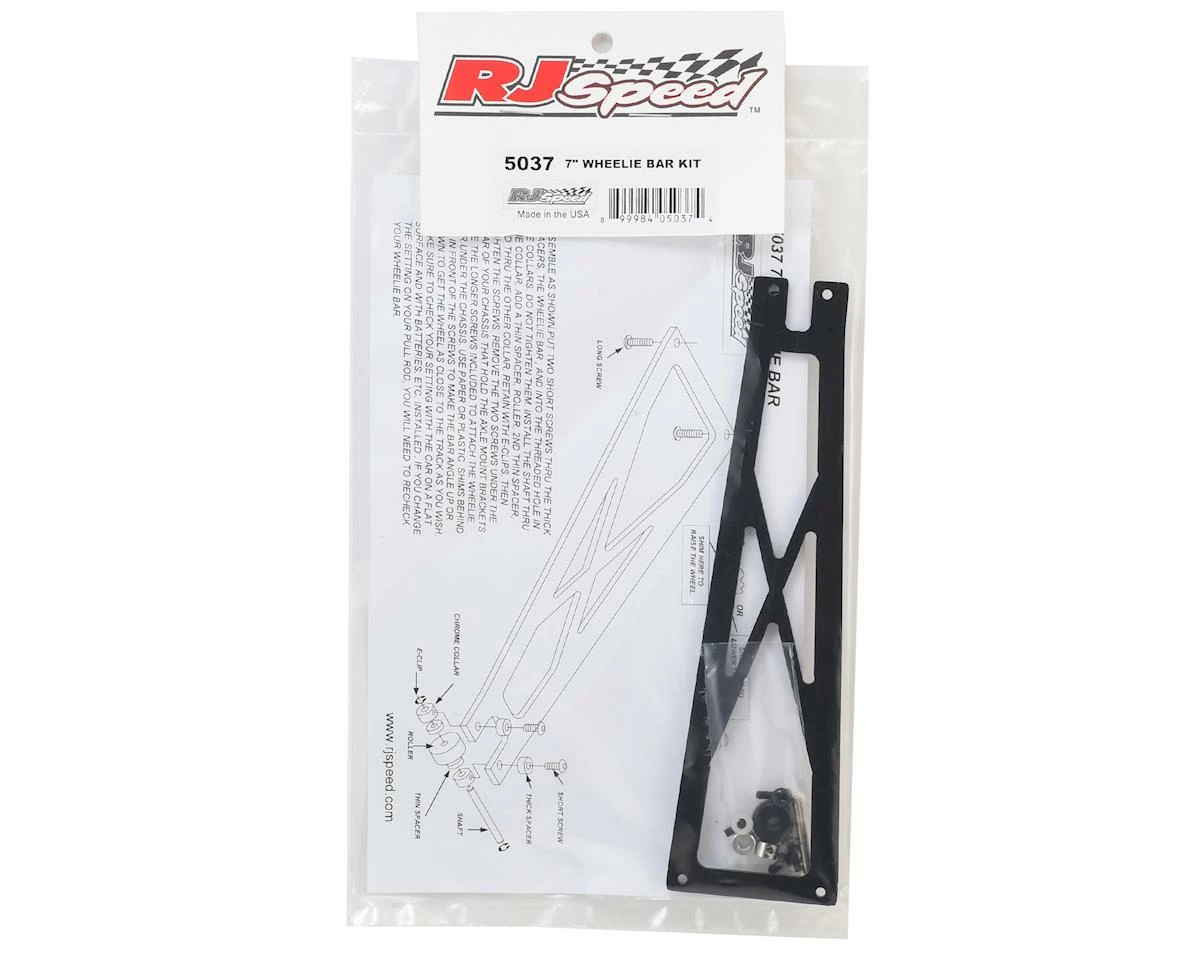 RJ Speed 7″ Wheelie Bar Kit. This wheelie bar assembly is made from G10 material and is compatible with RJ Speed electric Dragster, Funny Car, Pro Mod, Pro Stock and Top Fuel models. Package includes the parts needed to assemble and install one 7″ wheelie bar.
