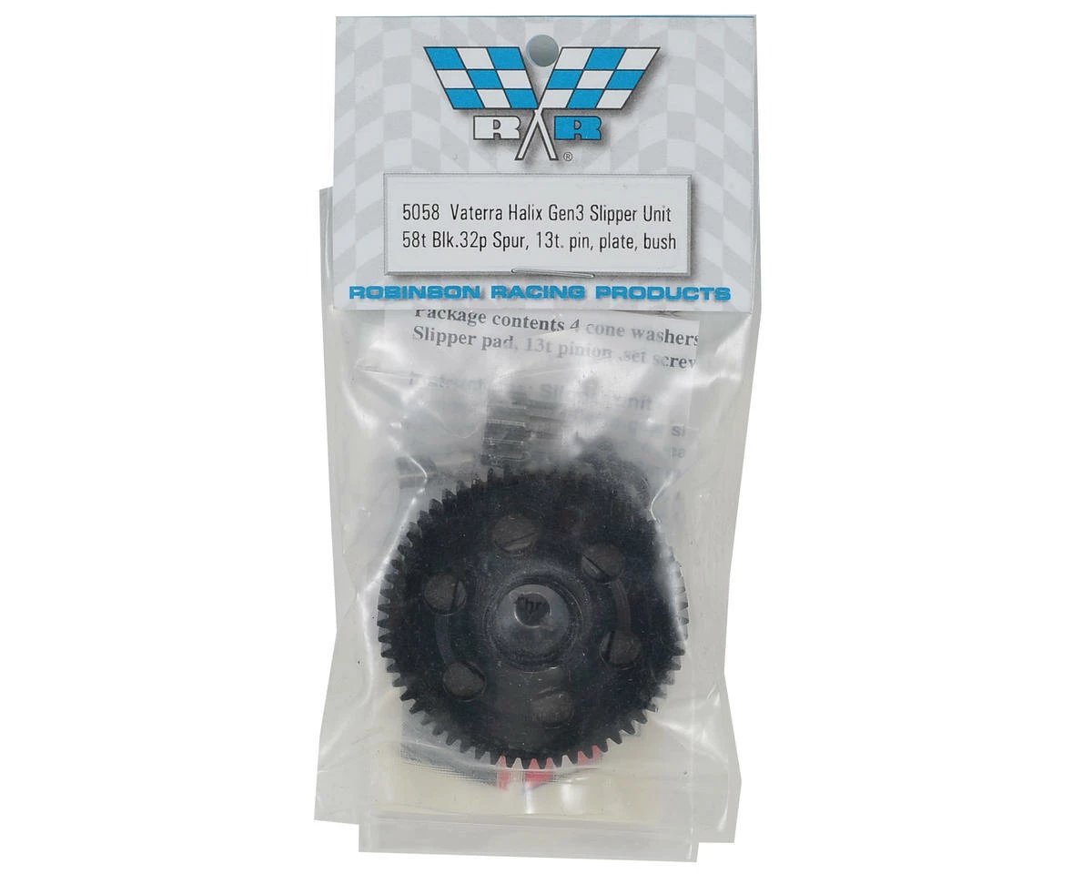 This is an optional Robinson Racing Vaterra Halix 32P Gen3 Slipper Kit. Robinson Racing has converted the stock 48 pitch gear set to extra heavy duty 32 pitch tooth profile. Running 3S LiPo? No problem! Don’t be afraid to pour on the power. A precision machined, hardened steel spur, with a blackened finish that improves lubricity (the capacity to reduce friction) and anti-galling (metal cracking/breaking from friction) characteristics resulting in better mating surfaces and smoother running gears. Upgrade your Halix and unleash the power!