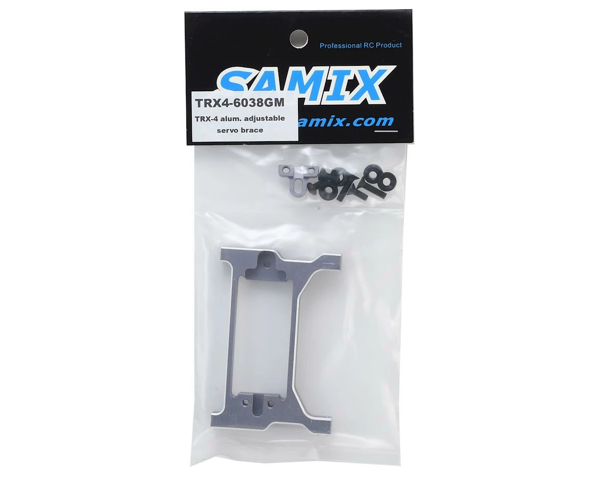 The Samix Traxxas TRX-4 Aluminum Adjustable Front Cross Brace/Servo Mount is an optional upgrade that will increase the strength of your chassis and features a sliding mount system that allows you to fit a variety of different servos. Available with your choice of a black, grey or silver finish, with silver chamfered edges and etched Samix logo, this will add strength and a custom touch of bling to your rig. Â