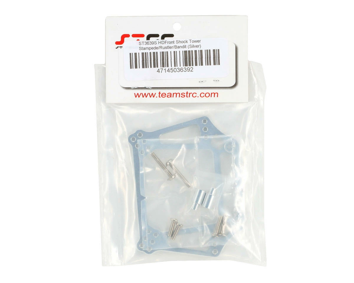 This is the ST Racing Concepts Silver Aluminum 6mm Heavy Duty Front Shock Tower. Using high quality CNC machined aluminum, these shock towers increase strength and enhance the looks of any Traxxas electric Stampede, Rustler, Slash or Bandit, as well as the Nitro Slash. Comes with all hardware (screws) and aluminum upper shock mount bushings.