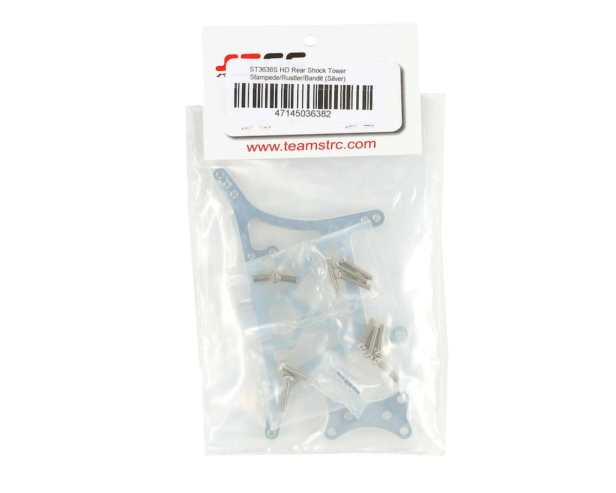 This is the ST Racing Concepts Silver Aluminum 6mm Heavy Duty Rear Shock Tower. Using high quality CNC machined aluminum, these shock towers increase strength and enhance the looks of any Traxxas electric Stampede, Slash or Rustler. Comes with all hardware (screws) and aluminum upper shock mount bushings.