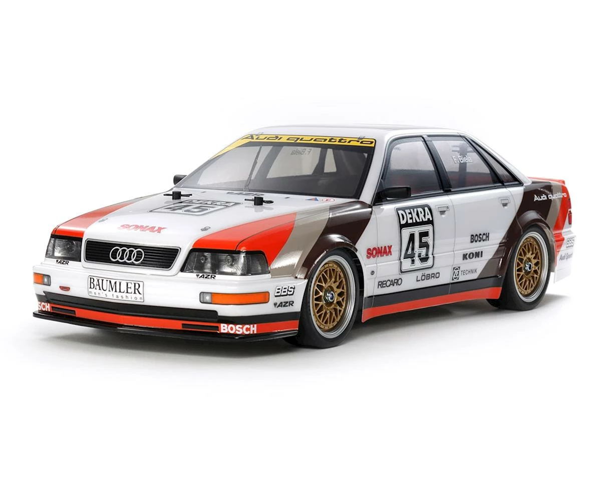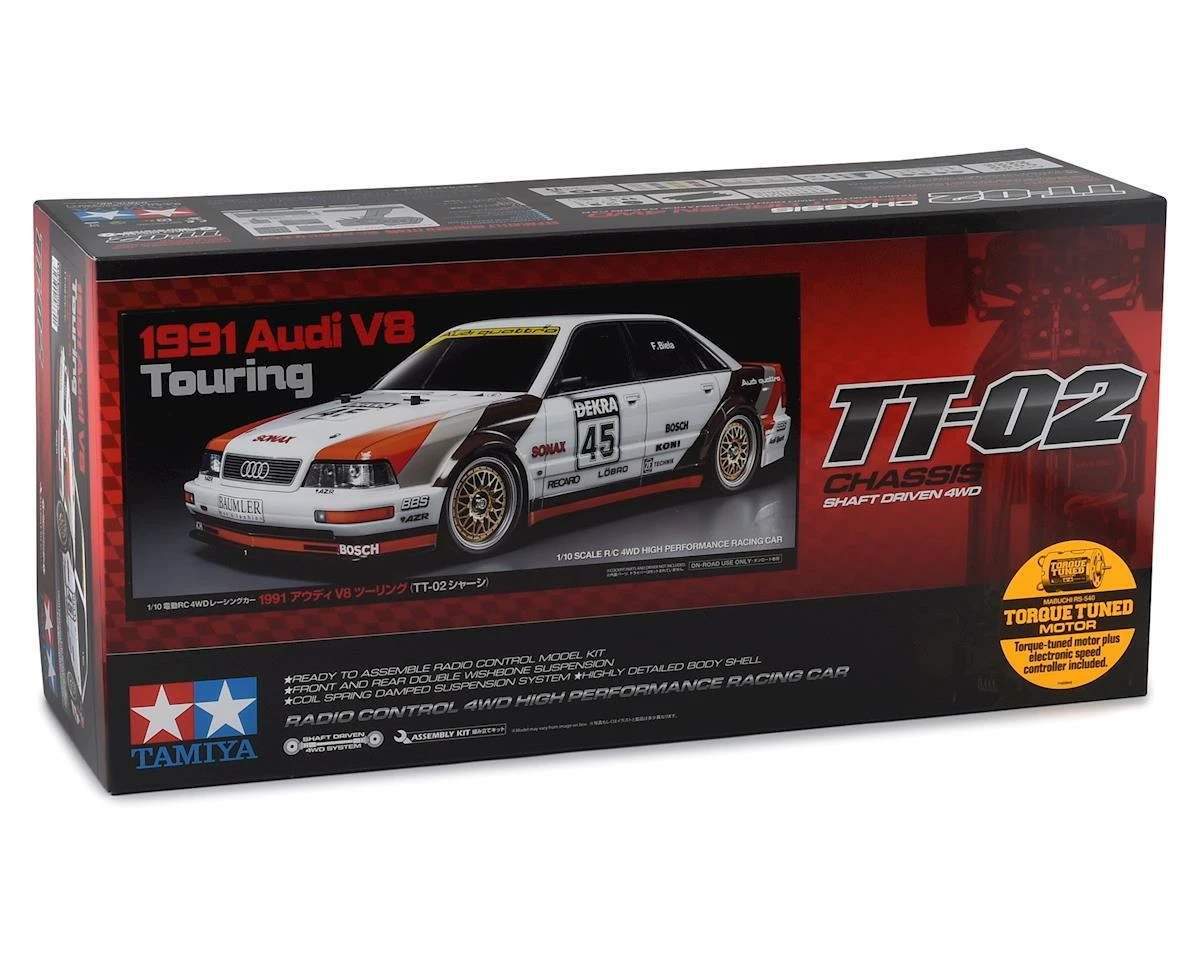 The Tamiya 1991 Audi V8 Touring 1/10 4WD TT-02 Electric Touring Car Kit recreates the classic Audi DTM racing car as raced during the DTM 1991 season. The Audi V8 touring car had a 456hp 3.6-liter V8 which graced the DTM (Deutsche Tourenwagen Masters) racing series in Germany. In that season, it took four victories overall and carried Frank Biela to the drivers’ title.