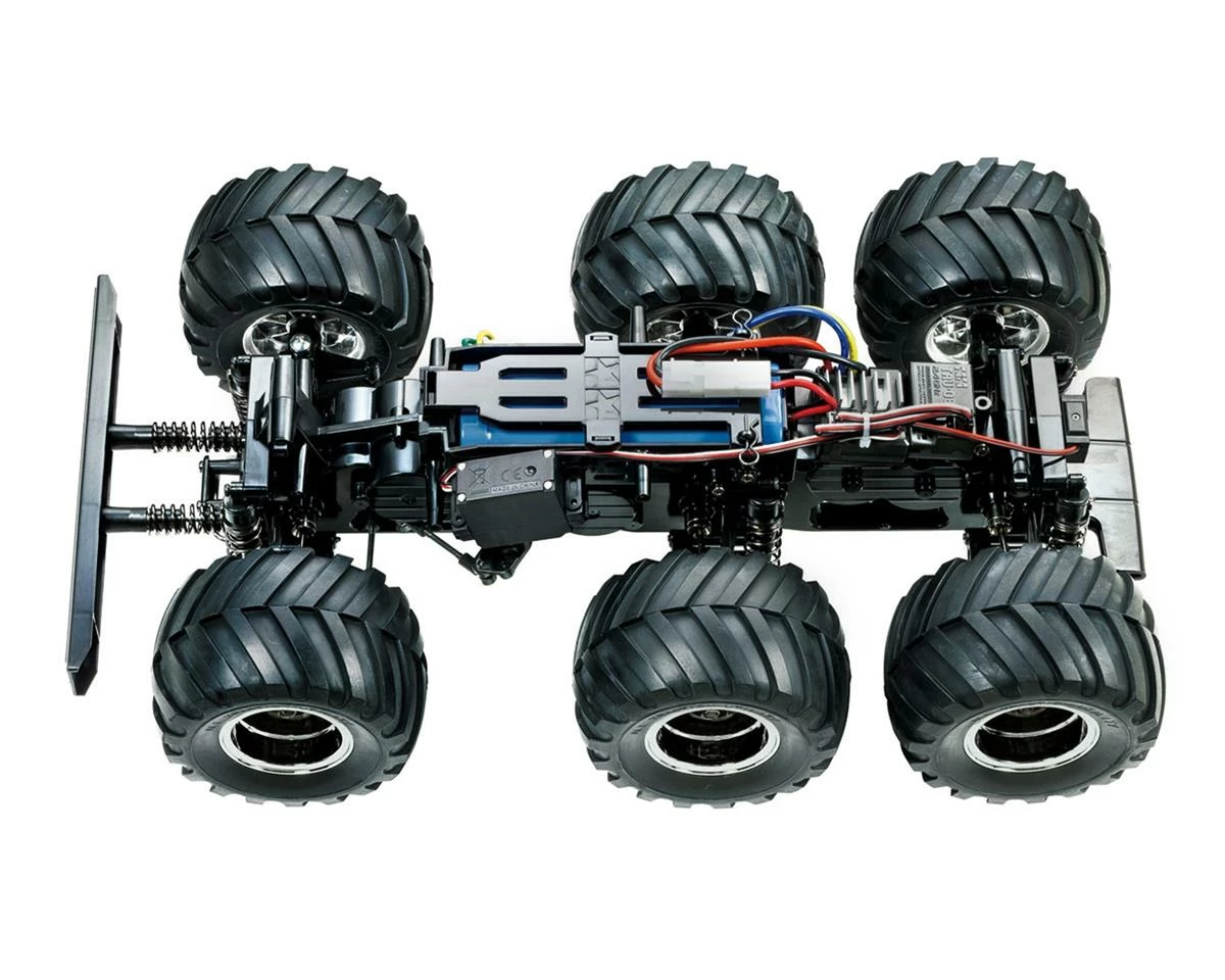 - The 6WD chassis employs 3 differential gears to transmit power from the front-center-mounted motor to all of the model’s wheels