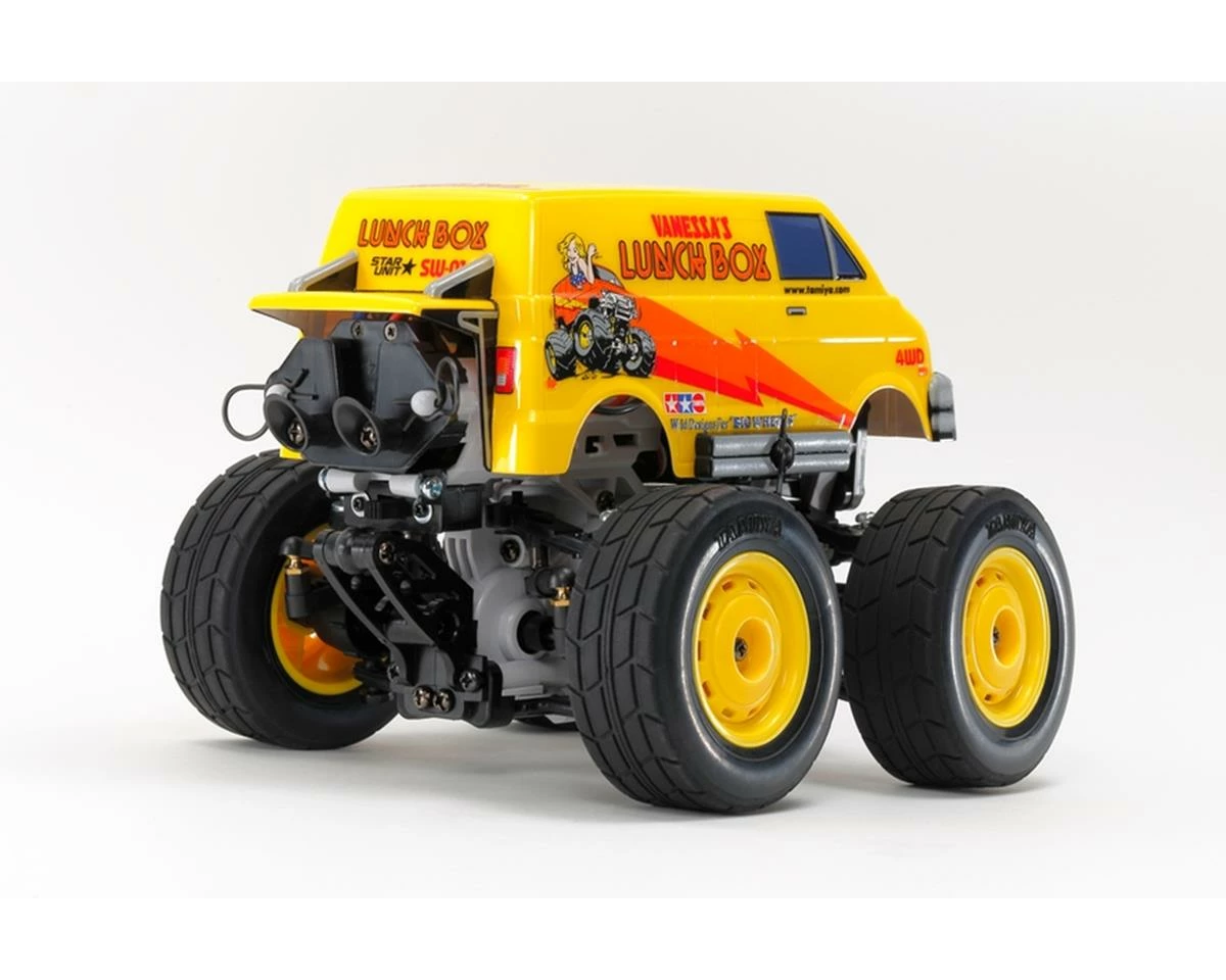The Tamiya Lunch Box Mini 1/24 Mini Kit takes the classic Lunch Box body and shrinks it down to fit on top of the 4WD SW-01 chassis. It is capable of 4-wheel steering using separately sold Upper Arm Connectors that not only allows you to steer with all four wheels on the ground, but it also allows the vehicle to steer while doing wheelies!