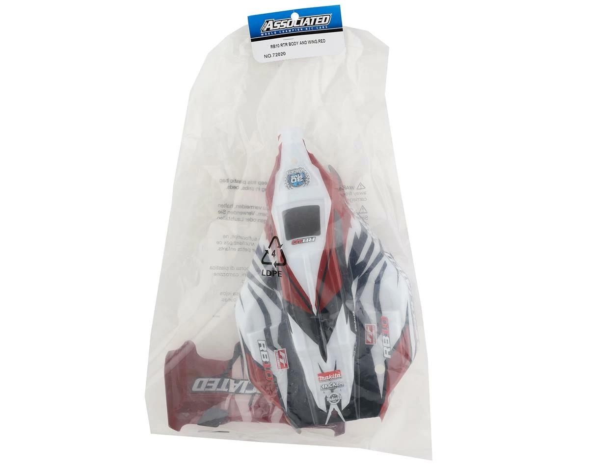 Team Associated RB10 RTR Pre-Painted Body and Wing. This replacement body and wing is intended for the Team Associated RB10 RTR. Made from a durable polycarbonate, this body comes pre-cut and pre-painted for ease of use. Package includes one body, one wing and one body shim.