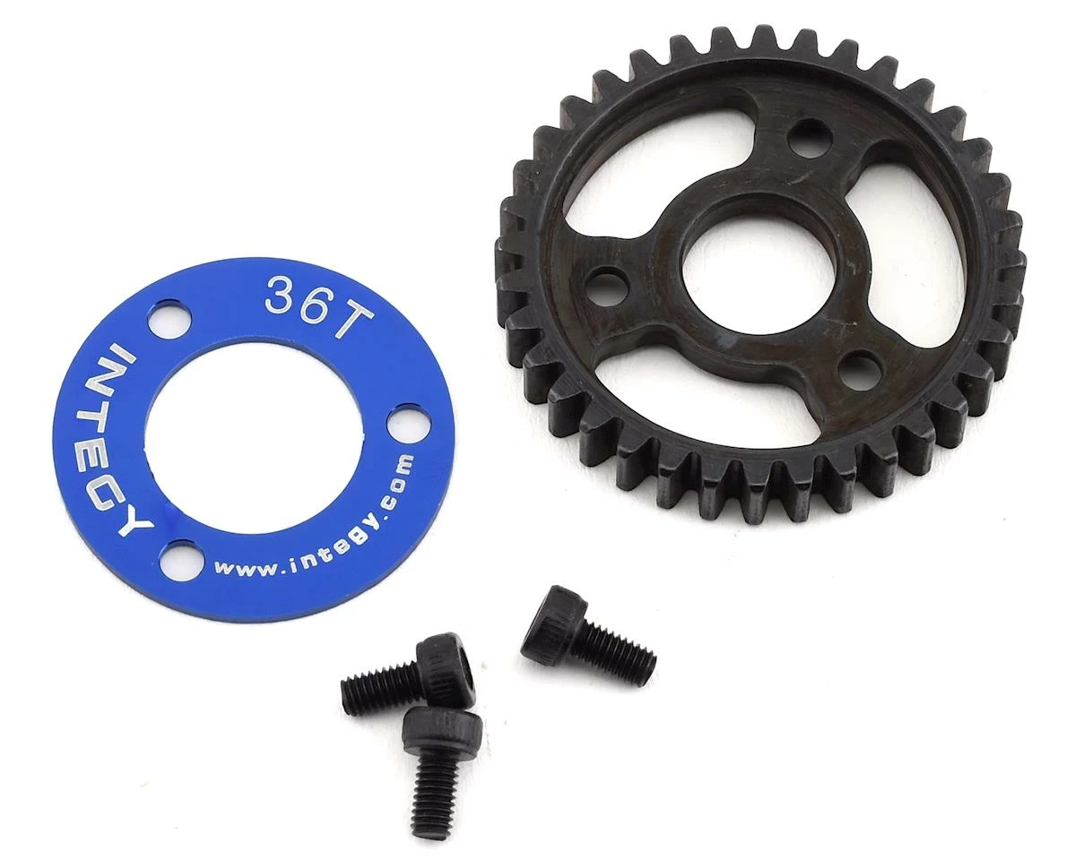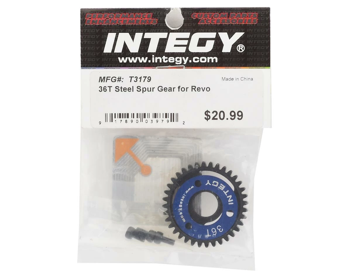 The optional Team Integy 36T Steel Spur Gear will replace the stock spur gear on both versions of the Traxxas Slayer or Traxxas 1/10 Revo with this high performance version. These 36 tooth spur gears are machined out of heavy duty steel to handle extra abuse. Most upgraded spur gears come in different teeth sizing, allowing you to change your gear ratios to suit the track.