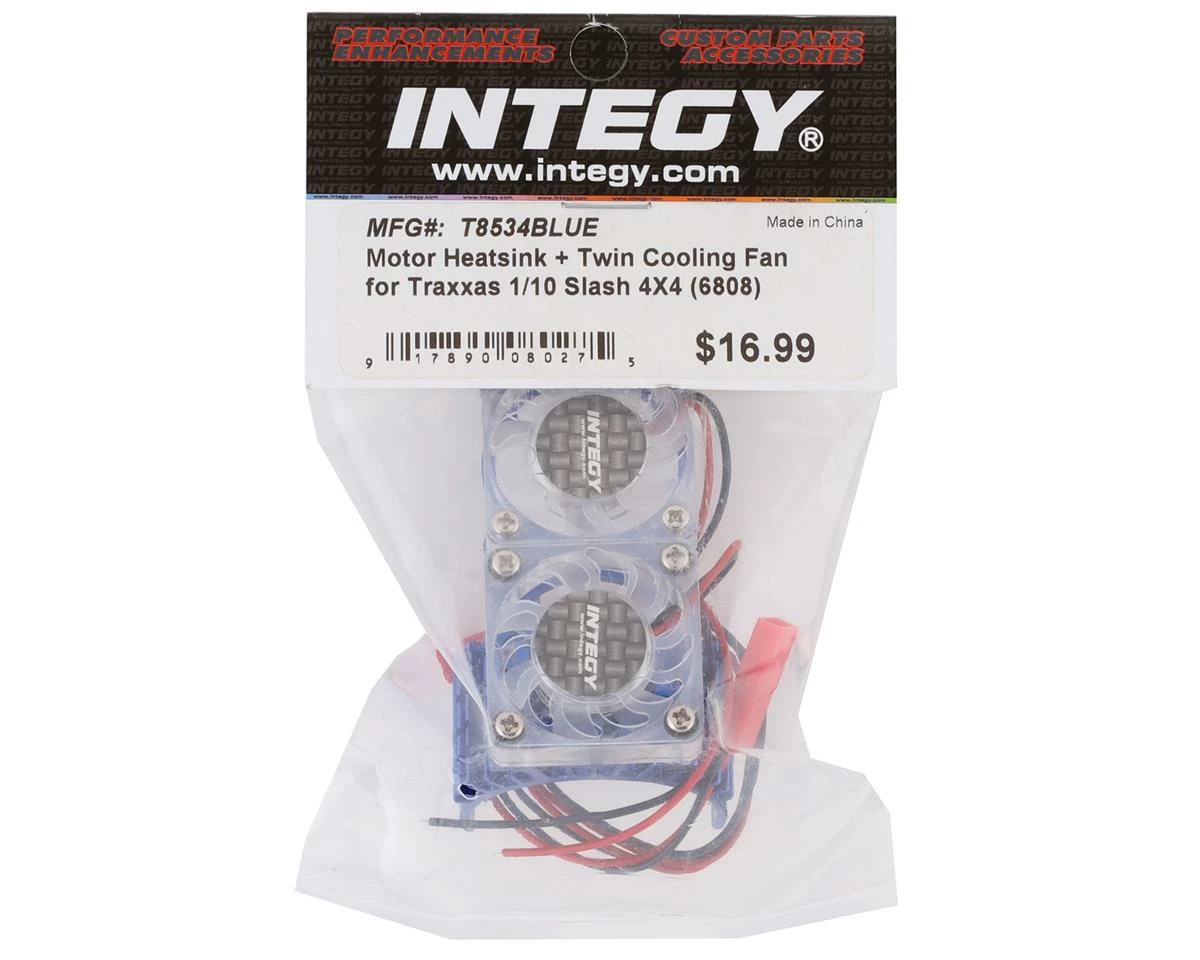 The Team Integy Slash 4X4 Motor Heatsink with Twin Fan is a great option part for those looking to keep the electronics in the Traxxas Slash 4×4 cooler. The motor heatsink will work for on a 550 or 540 size motor and features a nice blue anodized finish. The Cooling fan is powered through a JST style connector. Package includes one heatsink with two fans.
