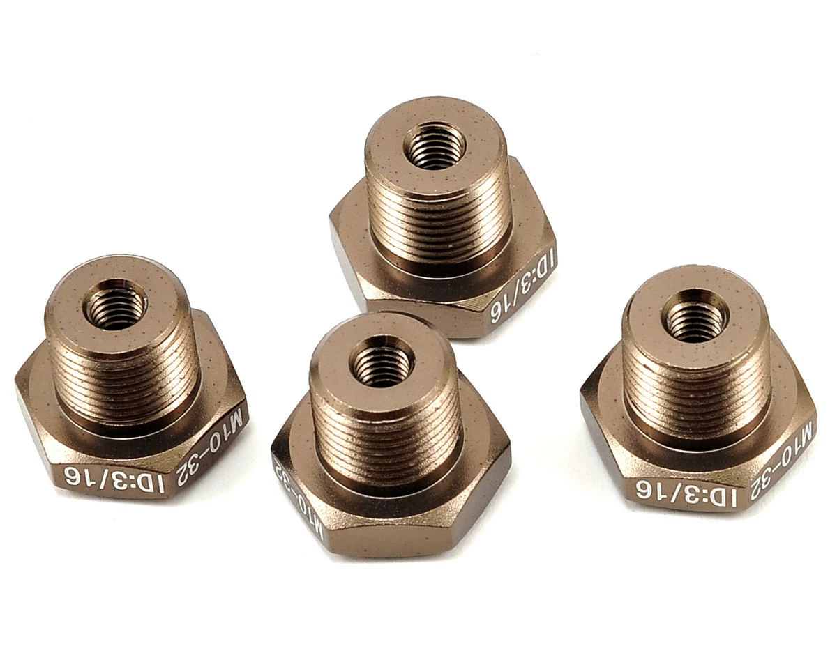 These adapters fit any 3/16″ x 10-32 threaded axles, example: Losi XXX/XXX-T, MF2, Losi 1/10 truck.Â